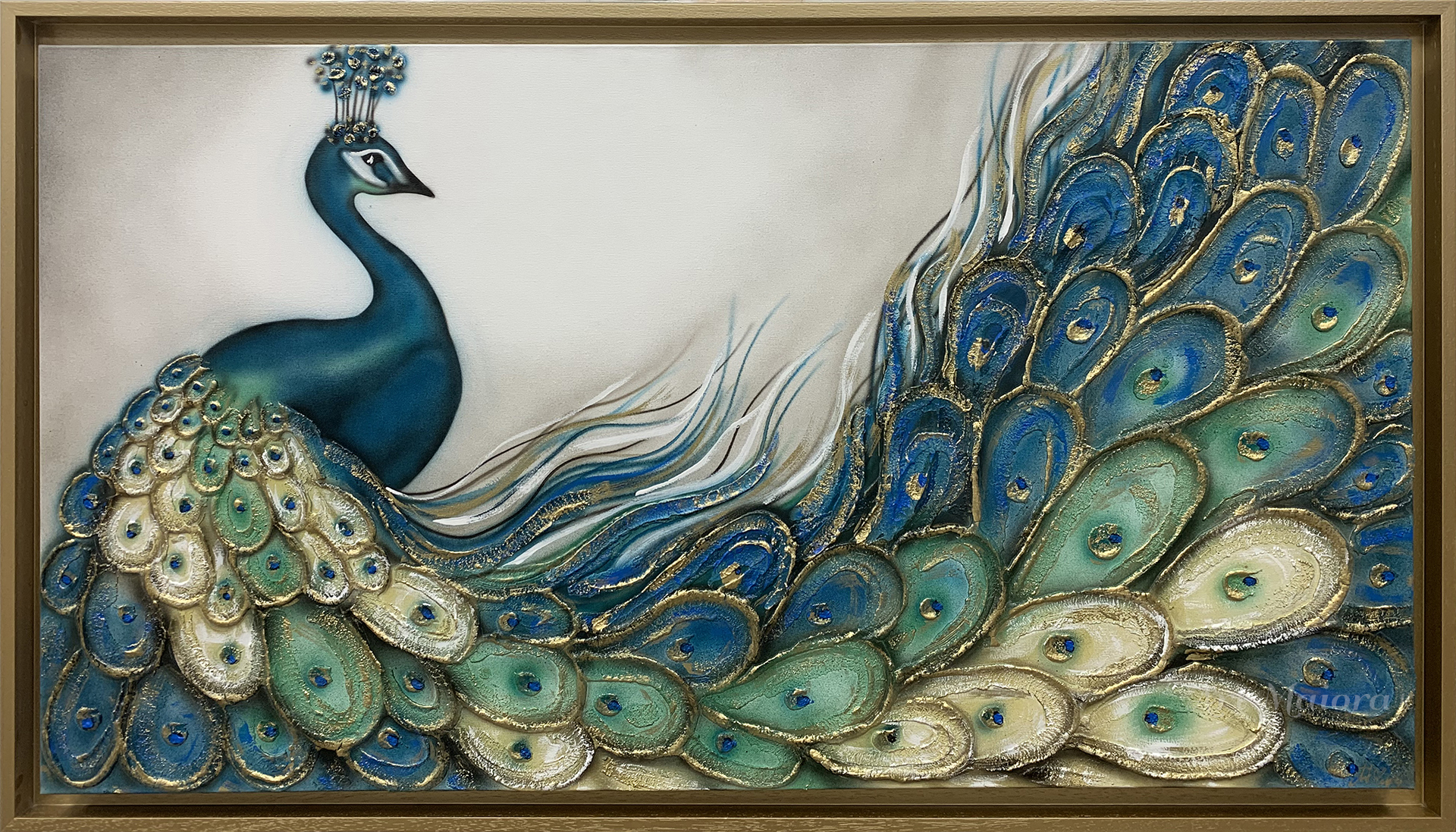 Quadro dipinto a mano “Narciso”, 140x80cm, finitura ottanio e argento, cornice ad l oro vintage.