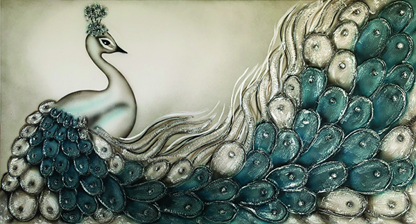 Quadro dipinto a mano “Narciso”, 130x70cm, finitura ottanio e argento, senza cornice.