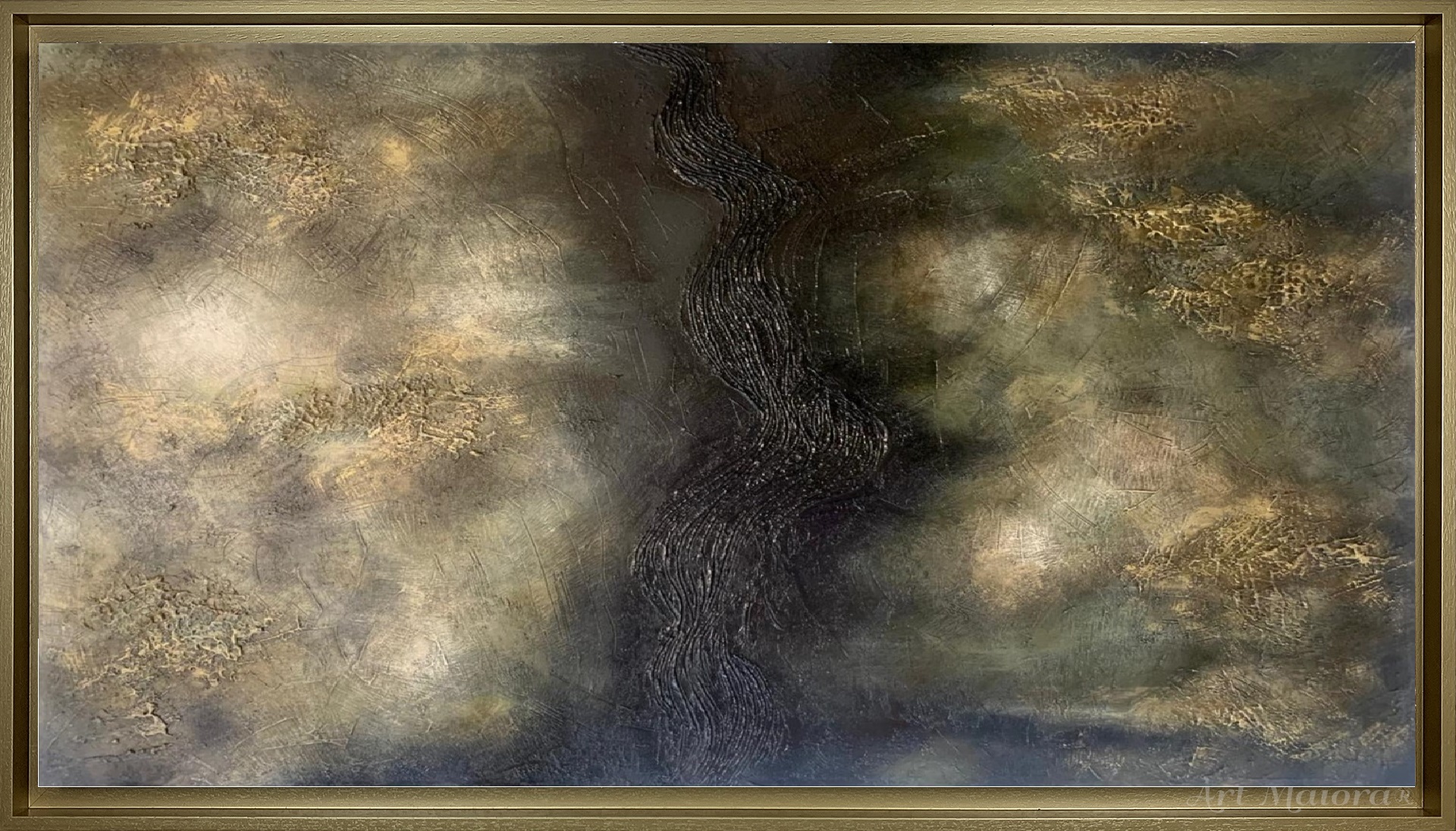 Quadro dipinto a mano “Nel Cuore Dell Inchiostro”, 140x80cm, finitura tradizionale, cornice ad l oro vintage.