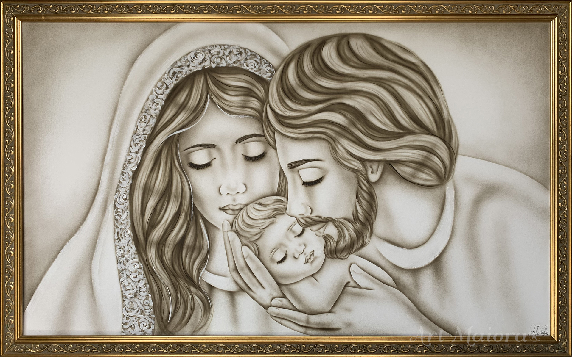 Quadro dipinto a mano “Nido D Amore Romantico”, 120x75cm, finitura tortora caldo, cornice decape oro.