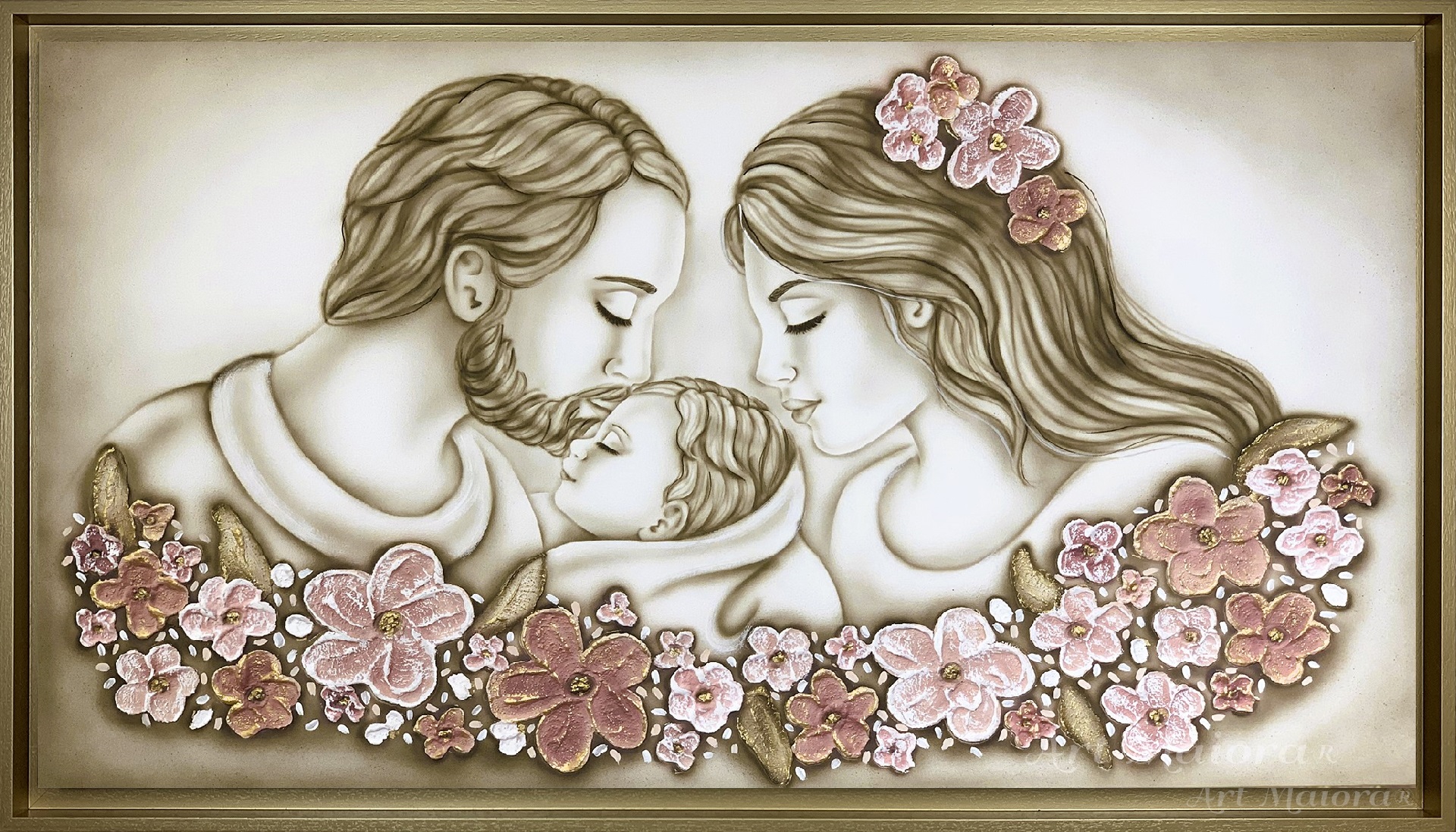 Quadro dipinto a mano “Non Ti Scordar Di Me”, 120x75cm, finitura tortora caldo con decori rosa, cornice ad l oro vintage.