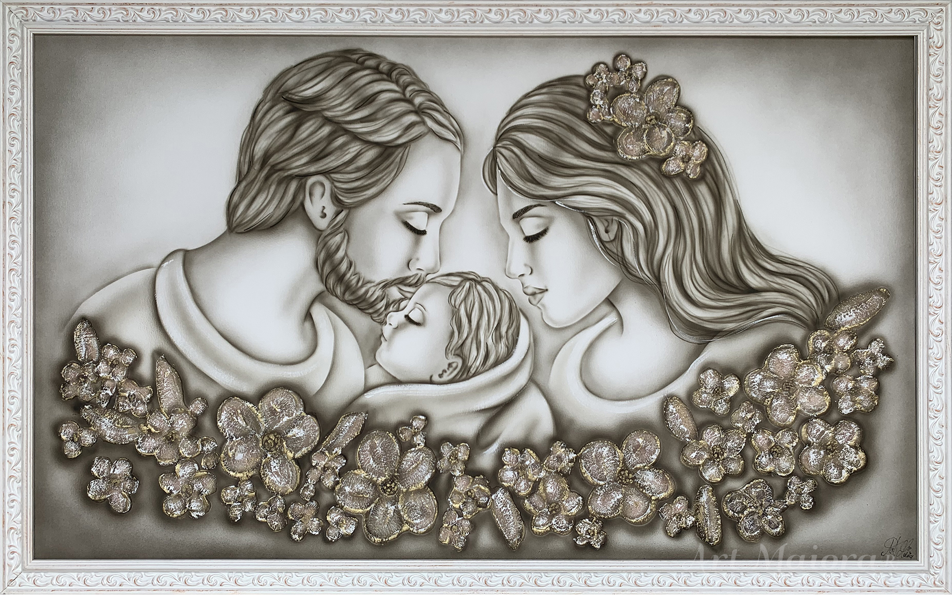 Quadro dipinto a mano “Non Ti Scordar Di Me”, 120x75cm, finitura tortora e decori bianchi e oro, cornice decape.