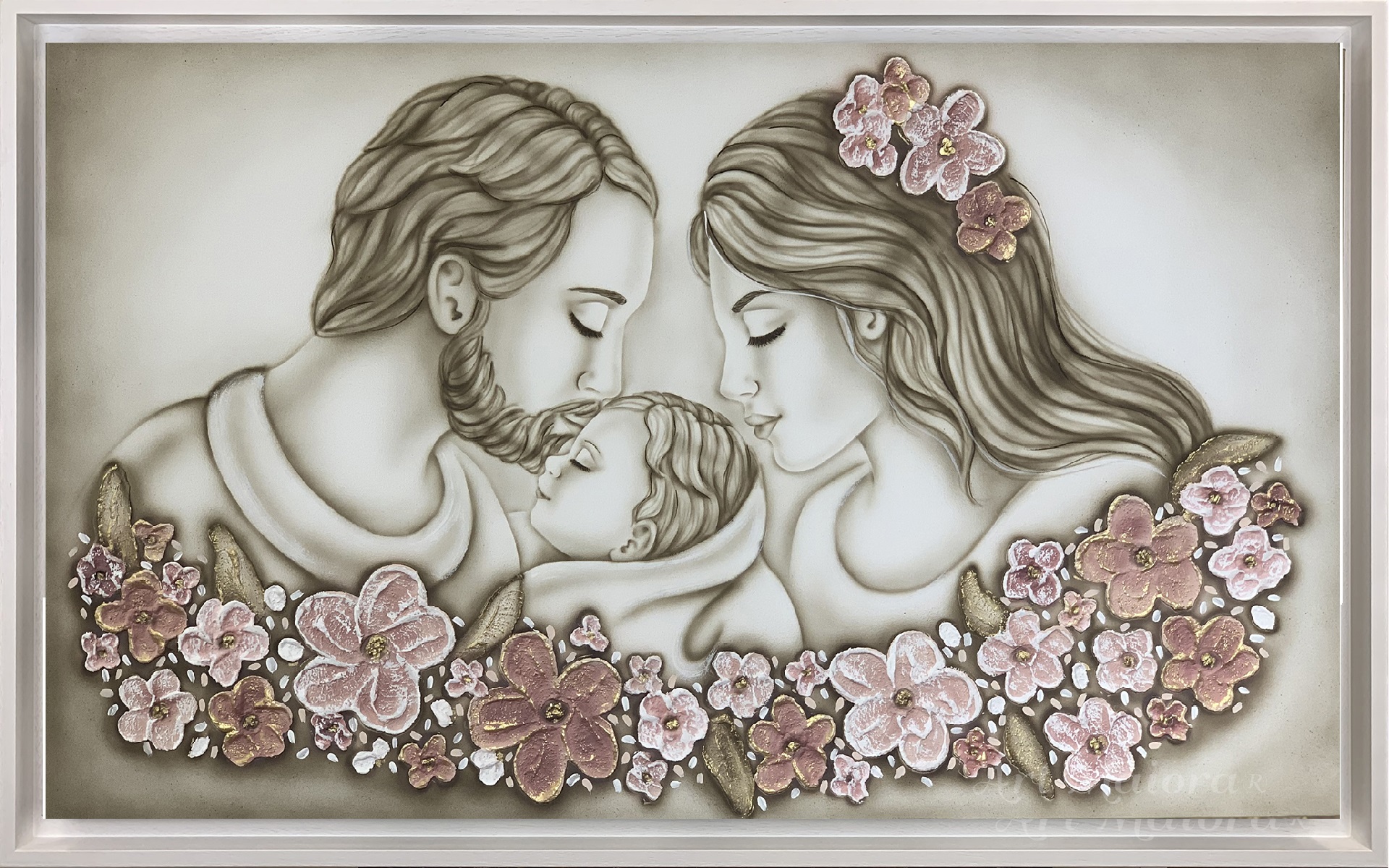 NON TI SCORDAR DI ME CON DIMENSIONE TELA DI 110 X 65 cm con FINITURA VARIANTE TORTORA E DECORI ROSA in abbinamento la CORNICE AD L BIANCA PORO APERTO. dipinto su tela realizzato a mano La dimensione finale del dipinto è 120 X 75 cm (larghezza x altezza)