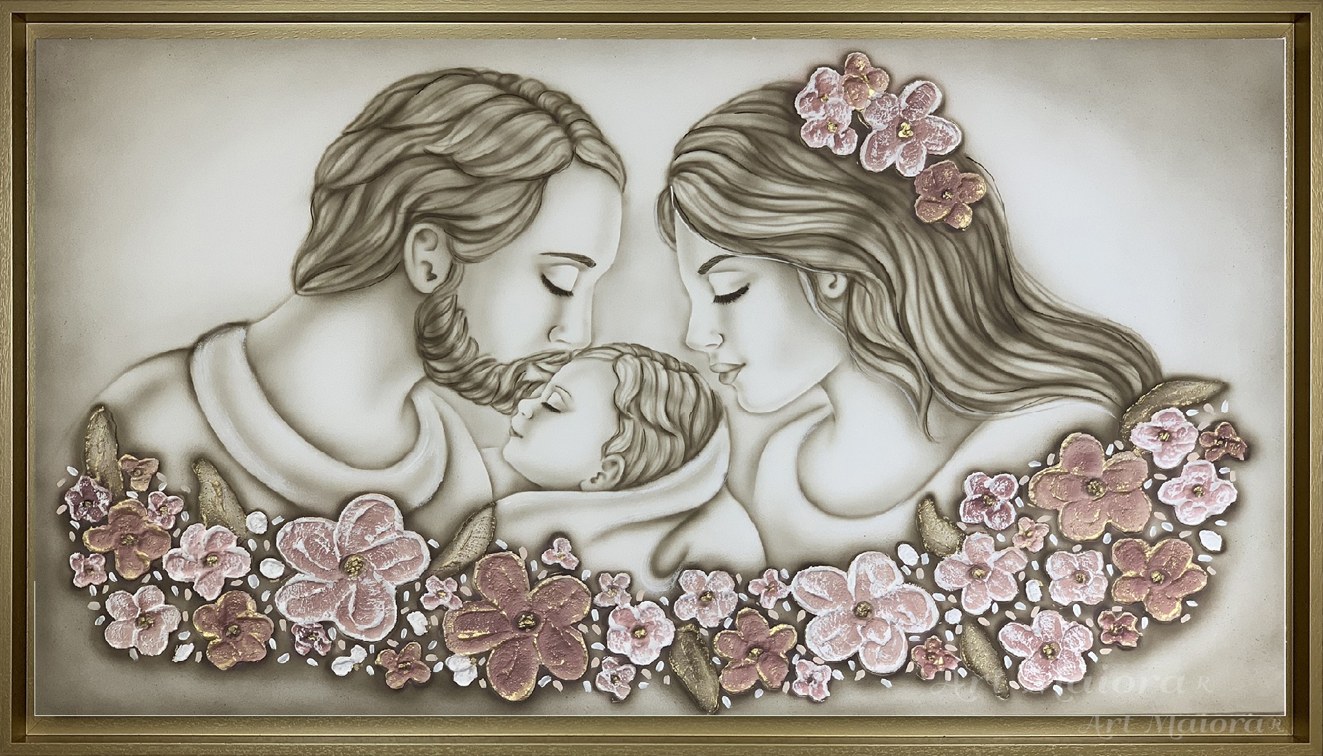 Quadro dipinto a mano “Non Ti Scordar Di Me”, 120x75cm, finitura tortora e decori rosa, cornice ad l oro vintage.