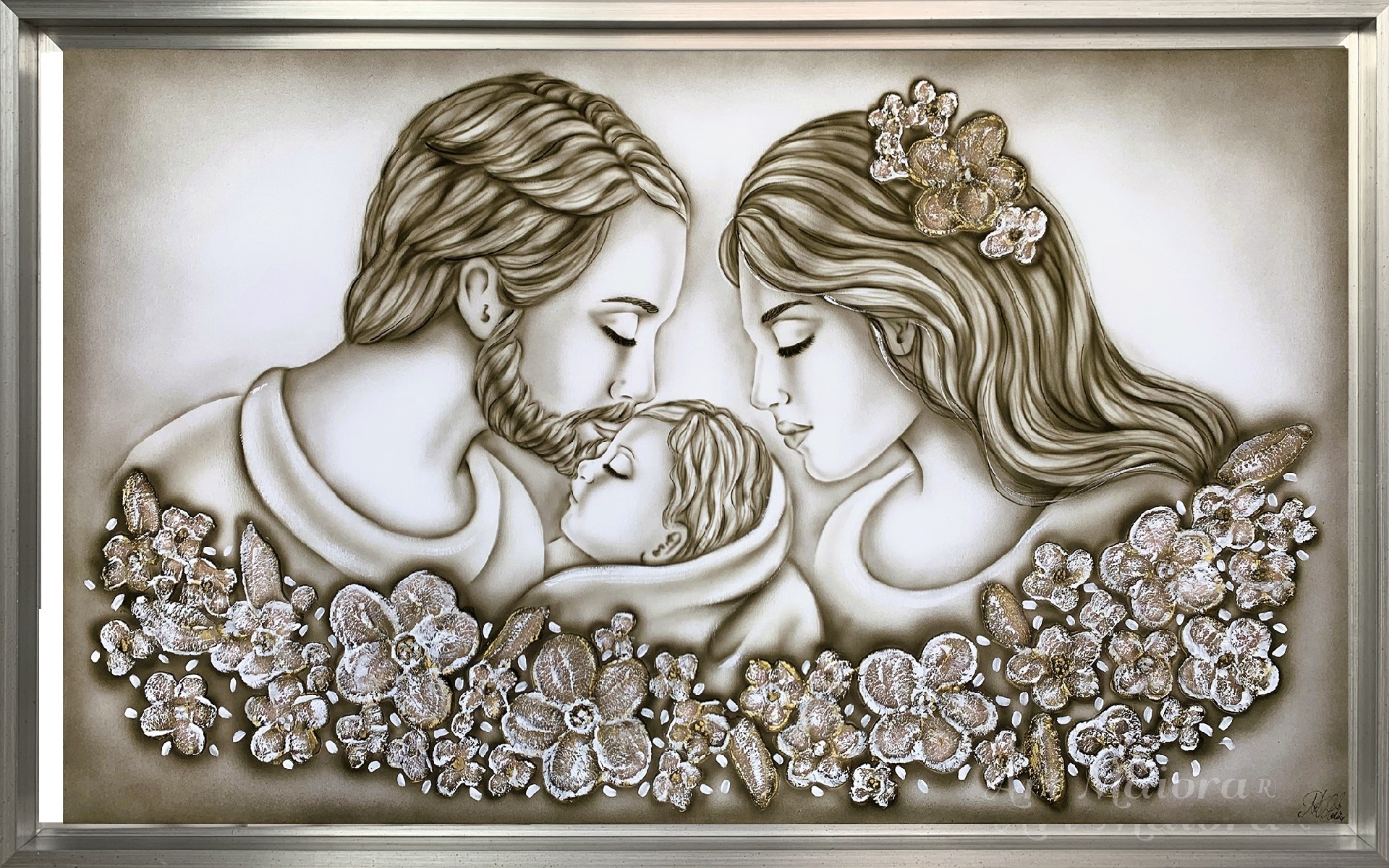 Quadro dipinto a mano “Non Ti Scordar Di Me”, 120x75cm, finitura tortora caldo con decori bianchi e oro, cornice ad l in argento.