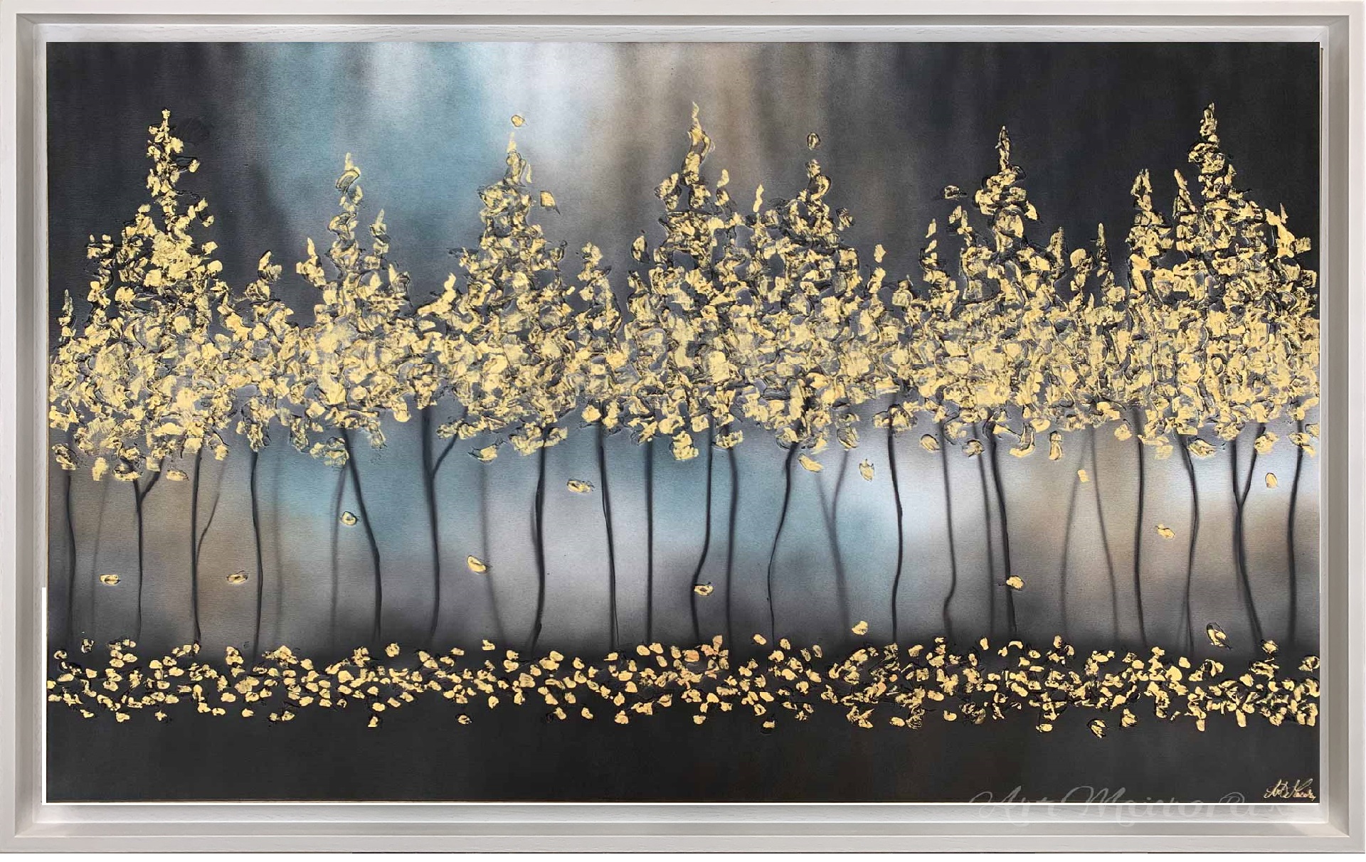 Quadro dipinto a mano “Notte Romantica”, 160x90cm, finitura silver, cornice ad l bianca poro aperto.