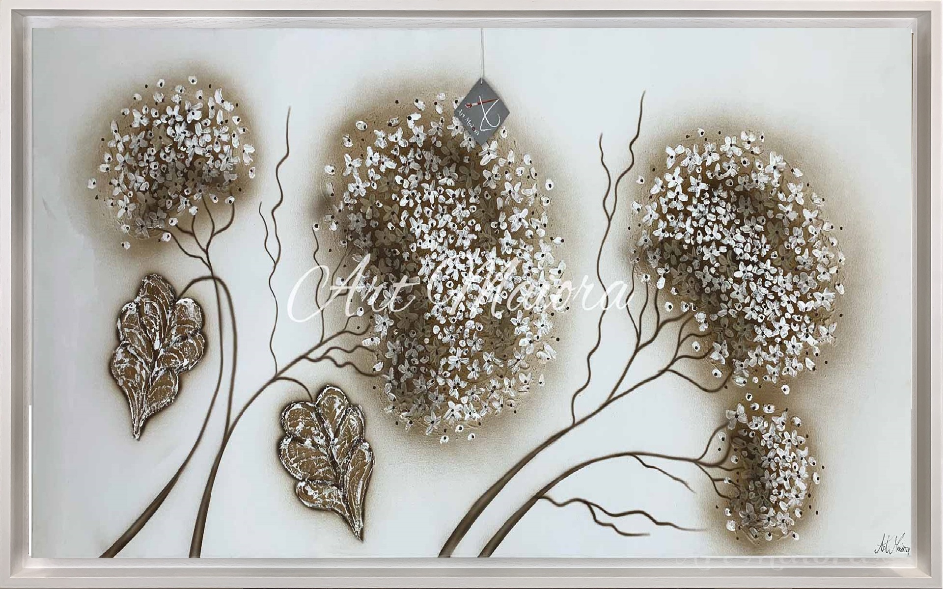 Quadro dipinto a mano “Ortensie”, 160x90cm, finitura tortora e nocciola, cornice ad l bianca poro aperto.
