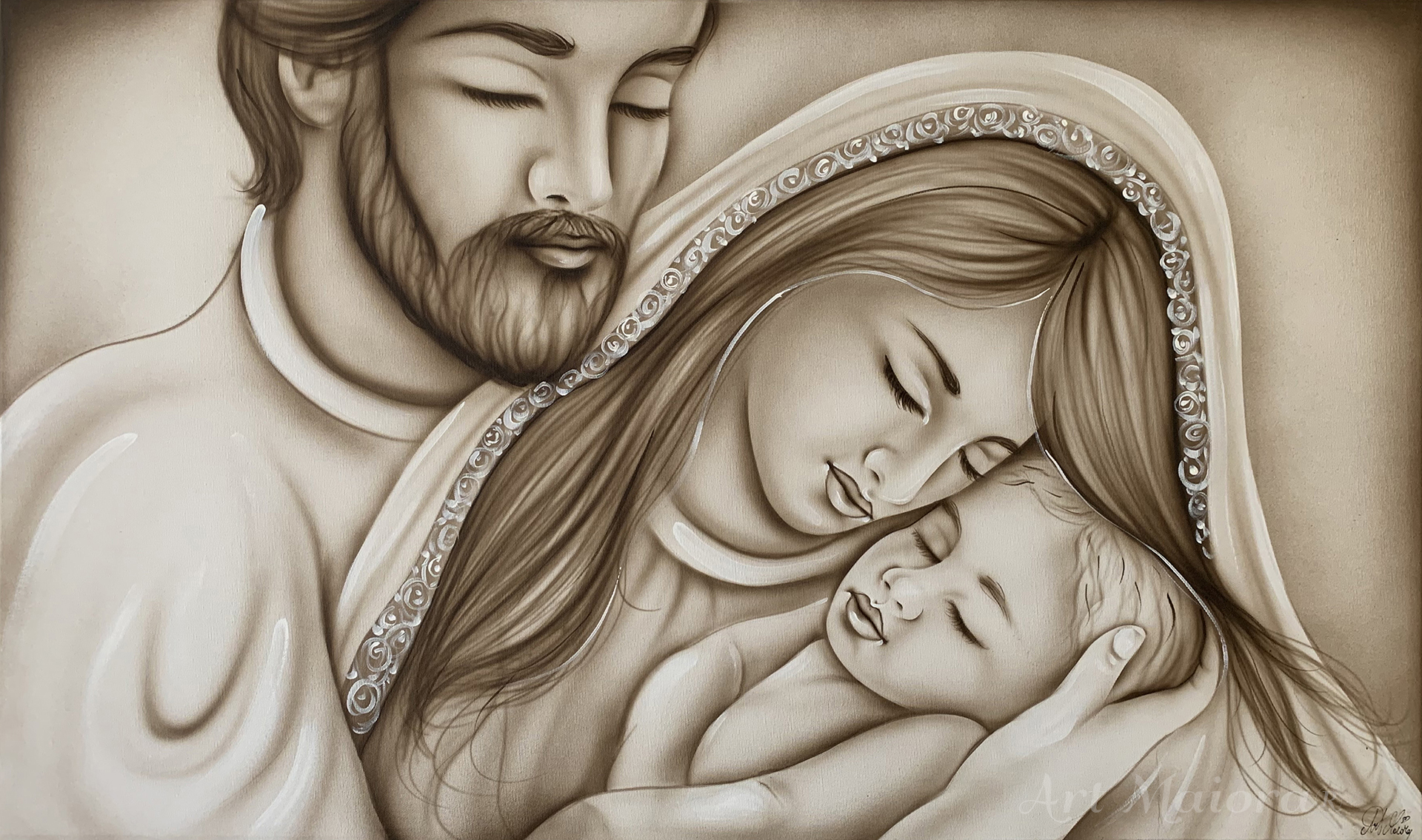 PAZIENZA CON DIMENSIONE TELA DI 110 X 65 cm con FINITURA VARIANTE TORTORA CALDO CON DECORI BIANCHI Senza Cornice. dipinto su tela realizzato a mano