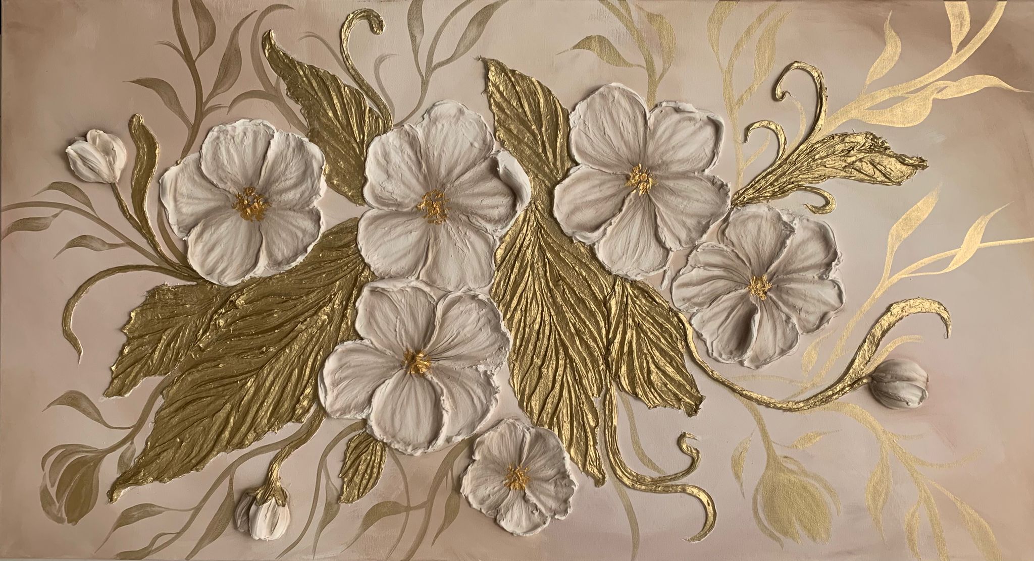Quadro dipinto a mano “Pink Palette”, 120x80cm, finitura panna e oro, senza cornice.