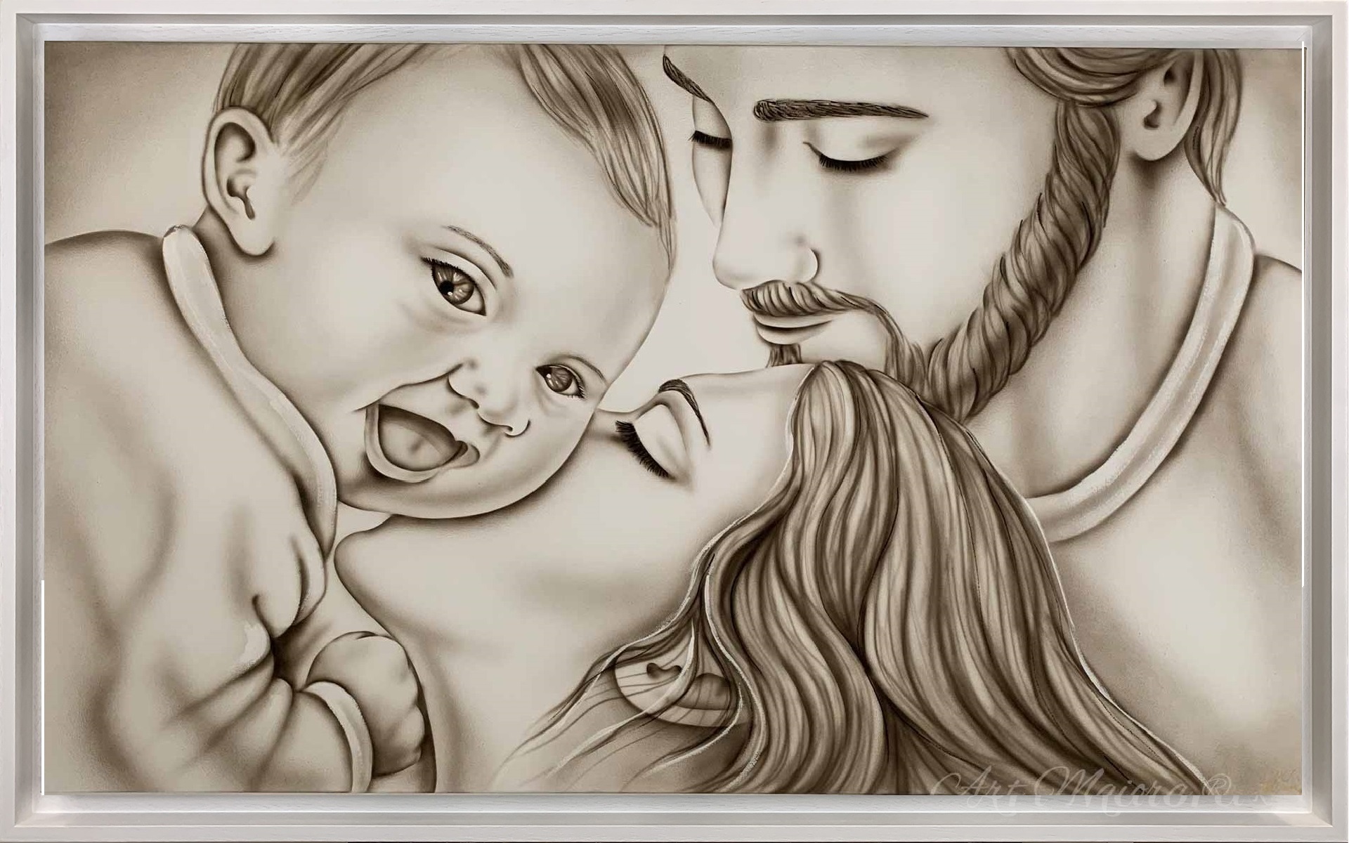 Quadro dipinto a mano “Sacra Famiglia Gaia”, 120x75cm, finitura tortora, cornice ad l bianca poro aperto.
