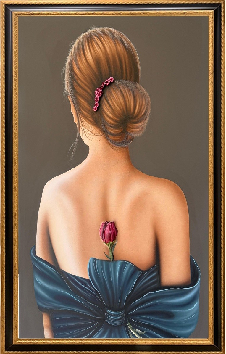 SCENT OF A WOMAN CON DIMENSIONE TELA DI 110 X 65 cm con FINITURA VARIANTE TORTORA CON FIORE A RILIEVO in abbinamento la CORNICE AD L NERO/ORO. dipinto su tela realizzato a mano La dimensione finale del dipinto è 120 X 75 cm (larghezza x altezza)