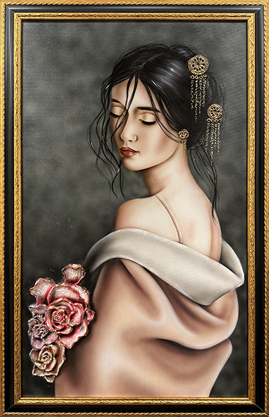 SERIE DONNE: ADARA CON DIMENSIONE TELA DI 110 X 80 cm con FINITURA CON DECORI MATERICI E VESTITO ROSA in abbinamento la CORNICE AD L NERO/ORO. dipinto su tela realizzato a mano La dimensione finale del dipinto è 120 X 90 cm (larghezza x altezza)