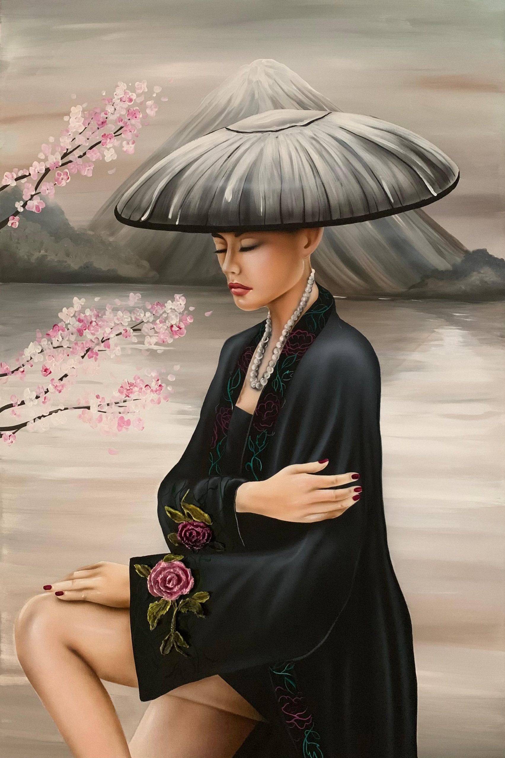 SERIE DONNE: HEIWA CON DIMENSIONE TELA DI 100 X 130 cm con FIORITURA DELLE ROSA Senza Cornice. dipinto su tela realizzato a mano