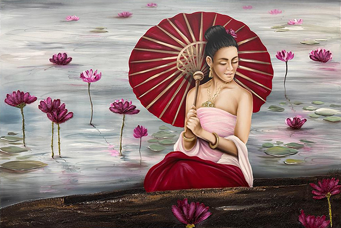 Quadro dipinto a mano “Serie Donne: Kumiko”, 150x100cm, finitura a colori, senza cornice.