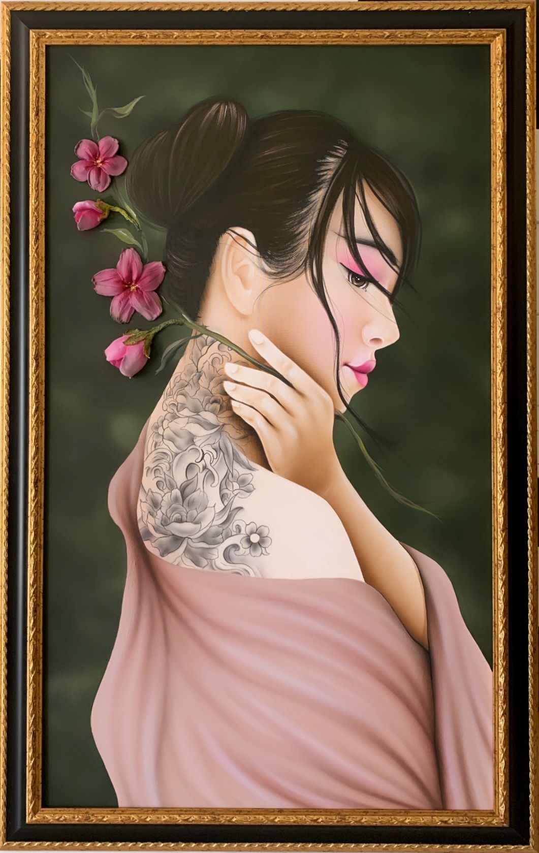 SERIE DONNE: YUMA CON DIMENSIONE TELA DI 110 X 65 cm con FINITURA VARIANTE FONDO VERDE CON MANTELLO ROSA ANTICO E FIORI A RILIEVO in abbinamento la CORNICE NERO E ORO. dipinto su tela realizzato a mano La dimensione finale del dipinto è 120 x 75 cm (larghezza x altezza)