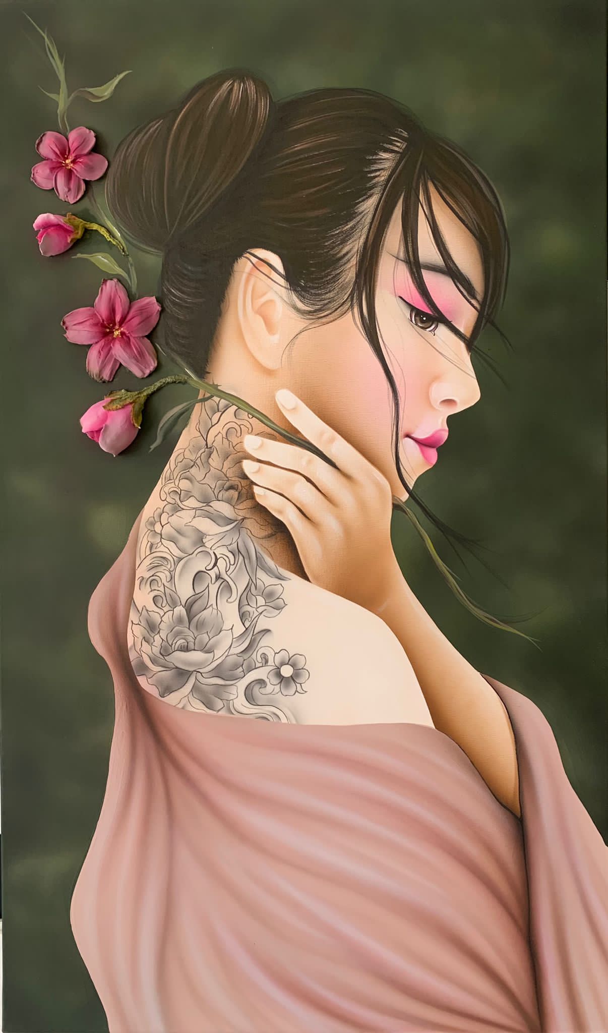 Quadro dipinto a mano “Serie Donne: Yuma”, 150x100cm, finitura fondo verde con mantello rosa antico e fiori a rilievo, senza cornice.