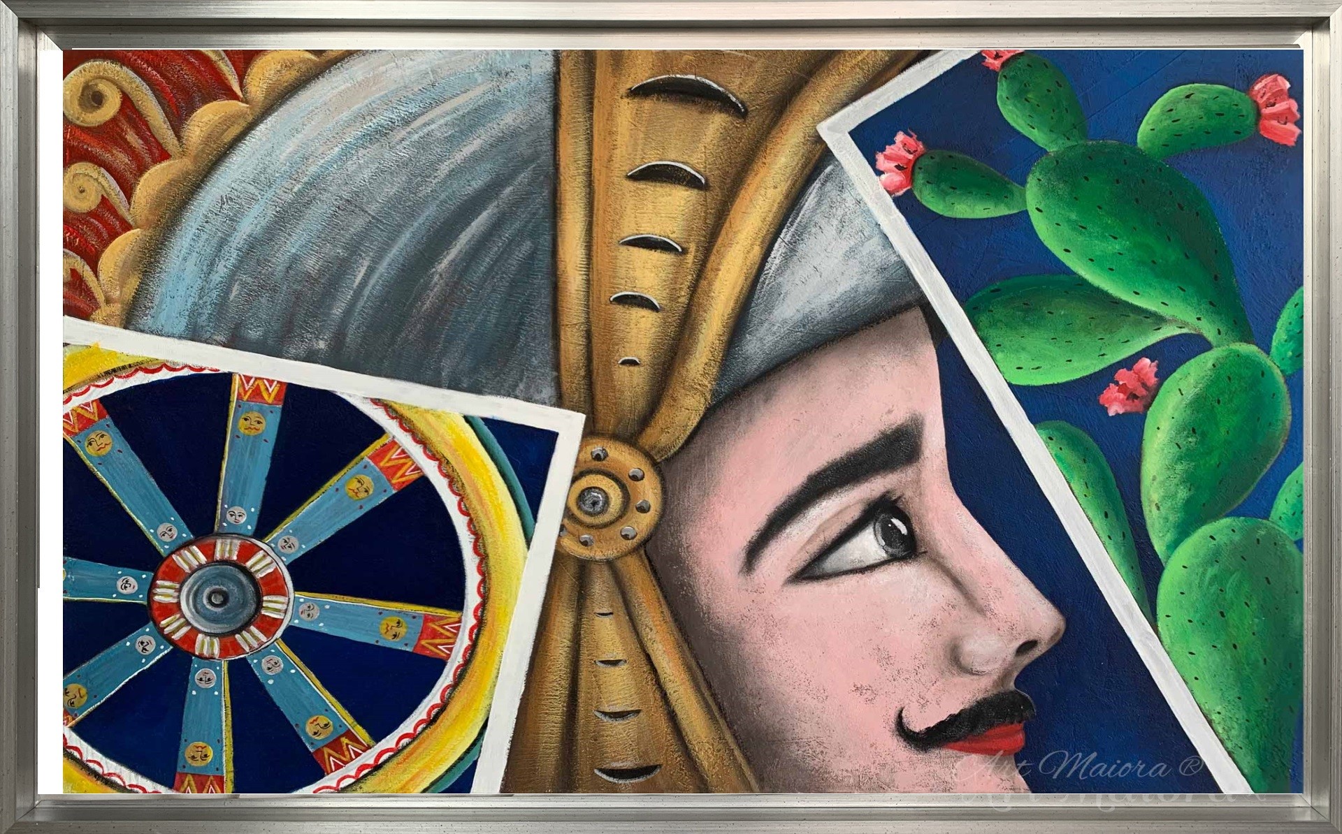 Quadro dipinto a mano “Sicily Stories”, 130x90cm, finitura a colori, cornice ad l in argento.