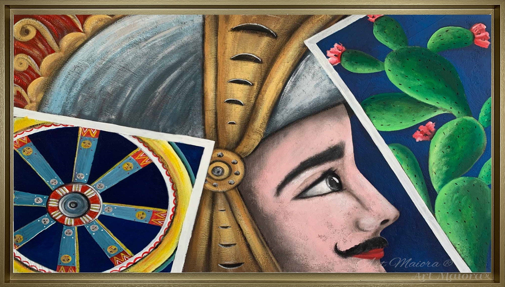 SICILY STORIES CON DIMENSIONE TELA DI 120 X 80 cm con FINITURA VARIANTE A COLORI in abbinamento la CORNICE AD L ORO VINTAGE. dipinto su tela realizzato a mano La dimensione finale del dipinto è 130 X 90 cm (larghezza x altezza)