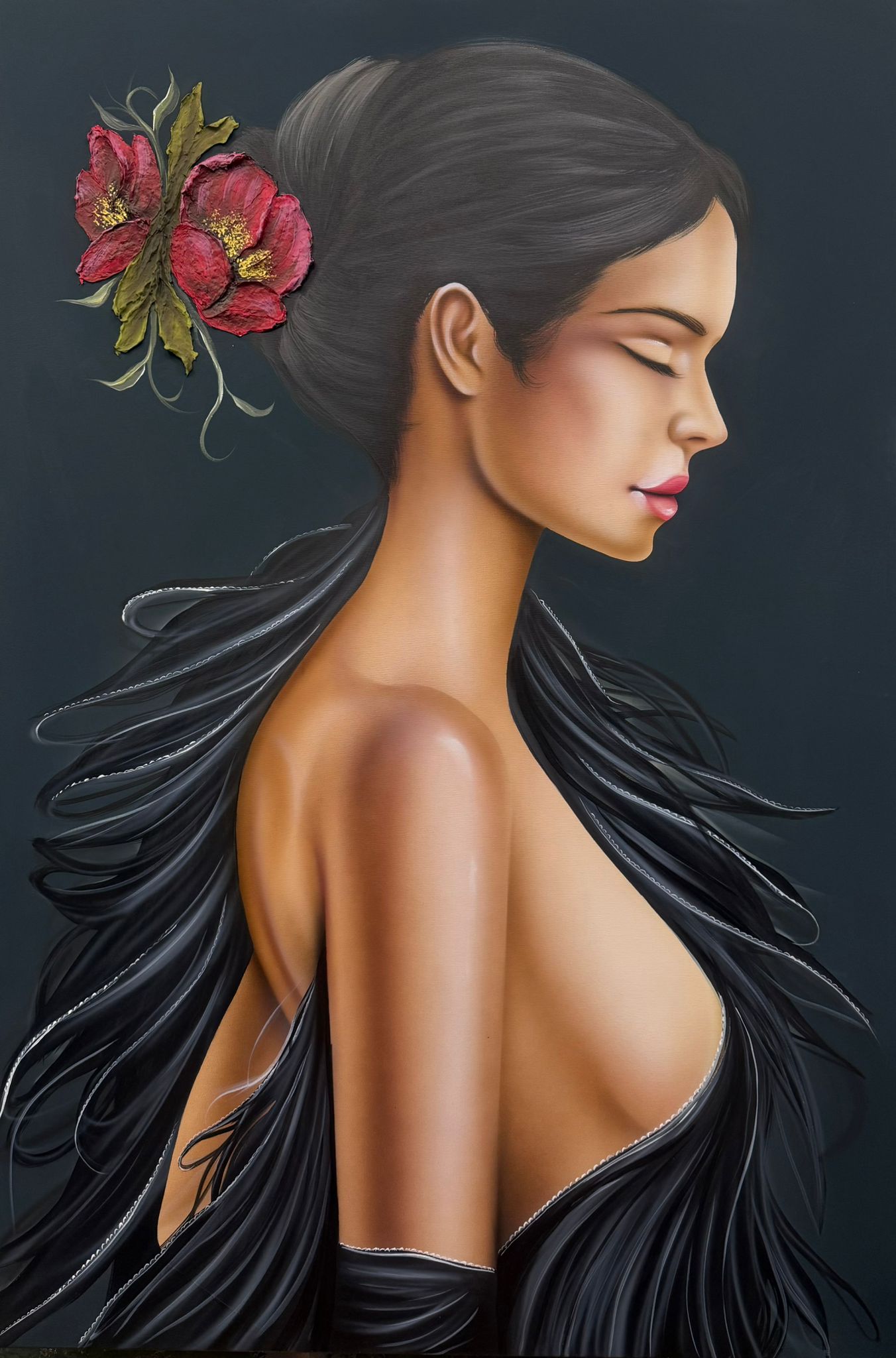 SOGNO DI VELI CON DIMENSIONE TELA DI 150 X 100 cm con FINITURA ANTRACITE VESTITO NERO CON RICAMI BIANCH Senza Cornice. dipinto su tela realizzato a mano