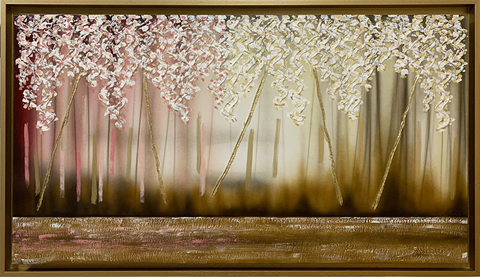 Quadro dipinto a mano “Sogno”, 140x80cm, finitura rosa e avorio, cornice ad l oro vintage.