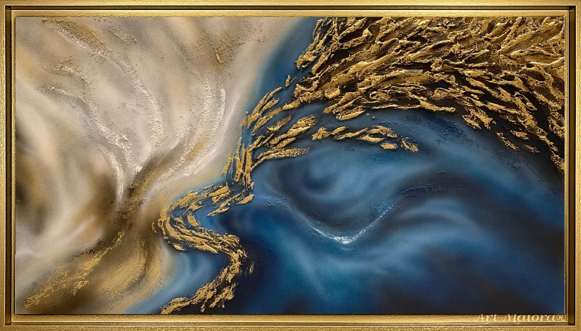 Quadro dipinto a mano “Terra E Mare In Danza”, 130x90cm, finitura tradizionale, cornice ad l oro vintage.