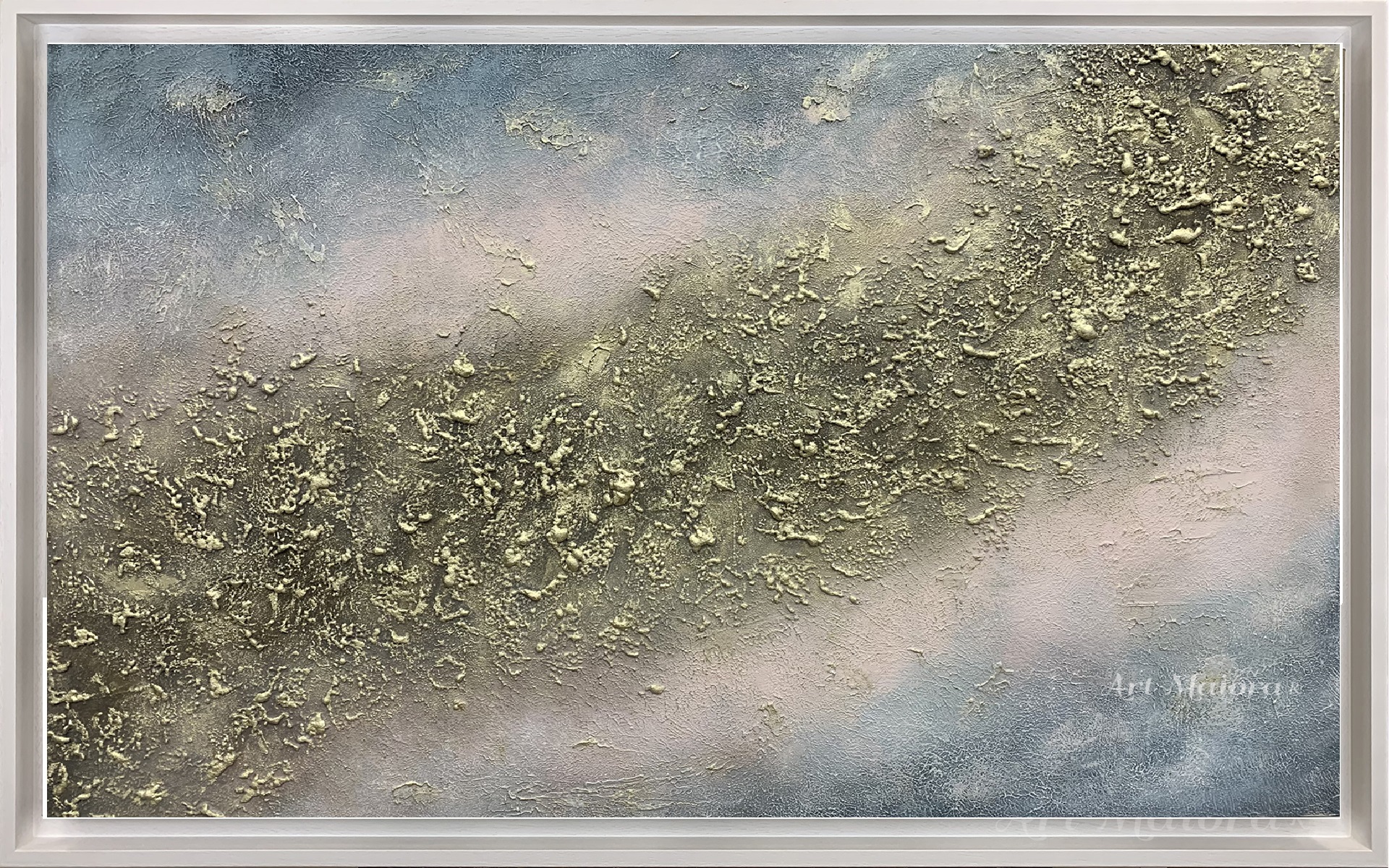 Quadro dipinto a mano “Tra Mare E Cielo”, 140x80cm, finitura tradizionale, cornice ad l bianca poro aperto.