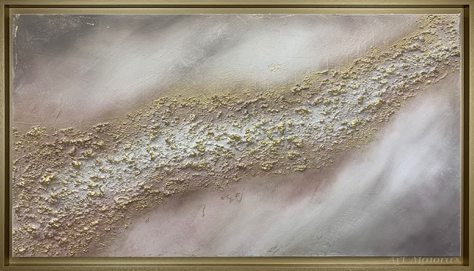 Quadro dipinto a mano “Tra Mare E Cielo”, 140x80cm, finitura nocciola, cornice ad l oro vintage.