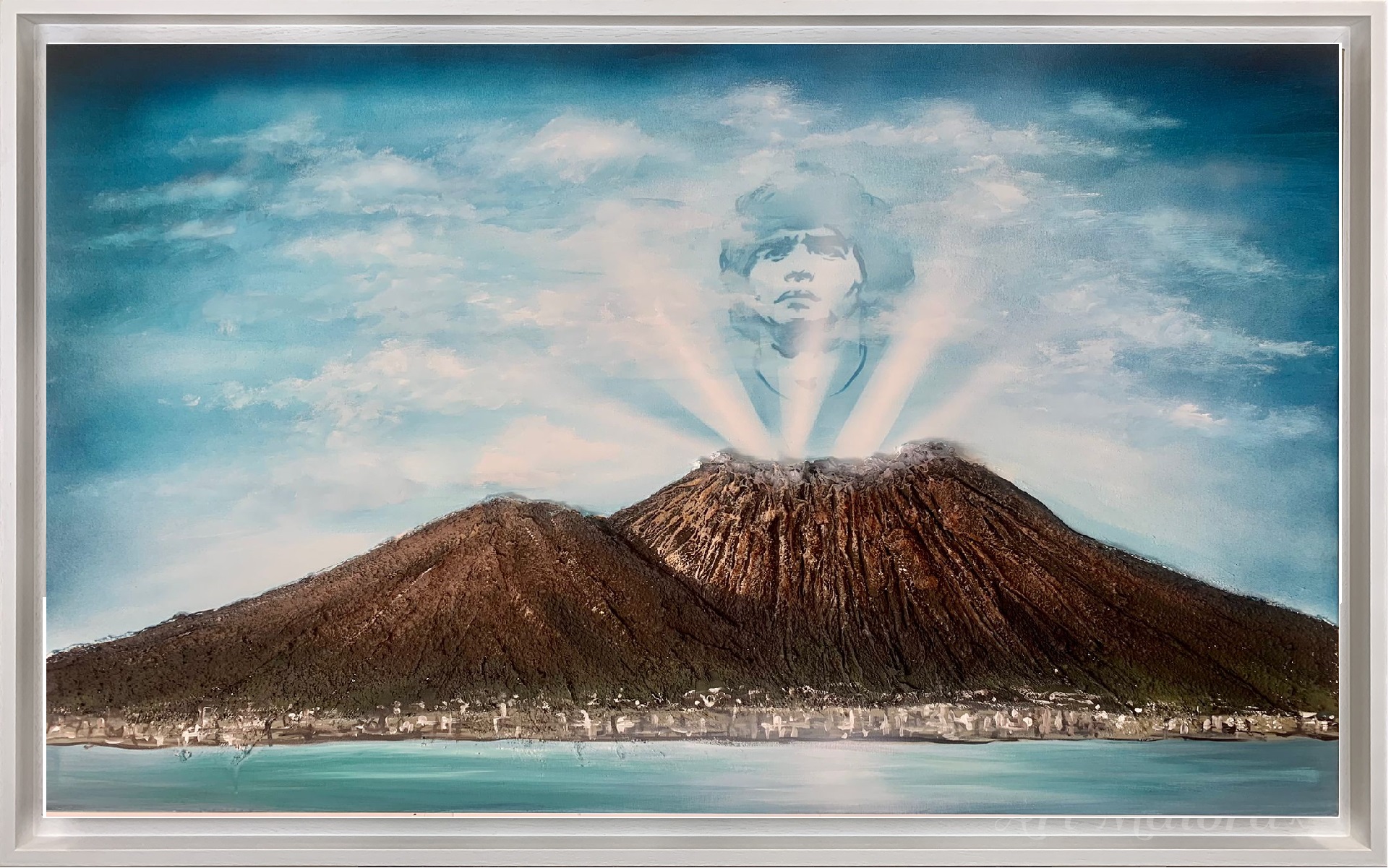 Quadro dipinto a mano “Vesuvio”, 130x90cm, finitura naple vision, cornice ad l bianca poro aperto.