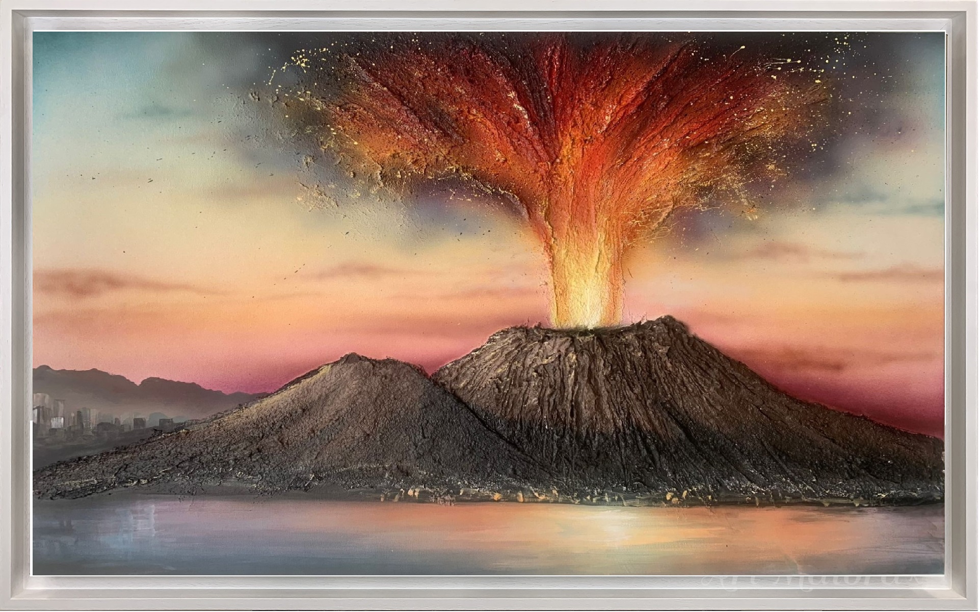 vesuvio CON DIMENSIONE TELA DI 150 X 80 cm con FINITURA VARIANTE MAGMA in abbinamento la CORNICE AD L BIANCA PORO APERTO. dipinto su tela realizzato a mano La dimensione finale del dipinto è 160 X 90 cm (larghezza x altezza)