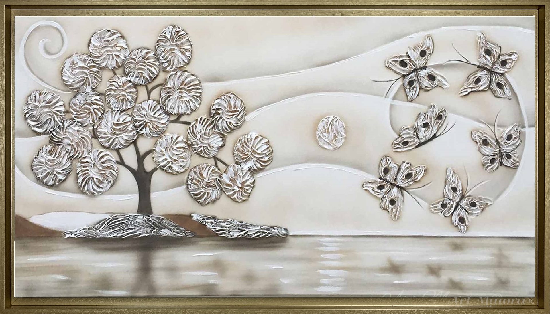 Quadro dipinto a mano “Volo”, 140x80cm, finitura new, cornice ad l oro vintage.