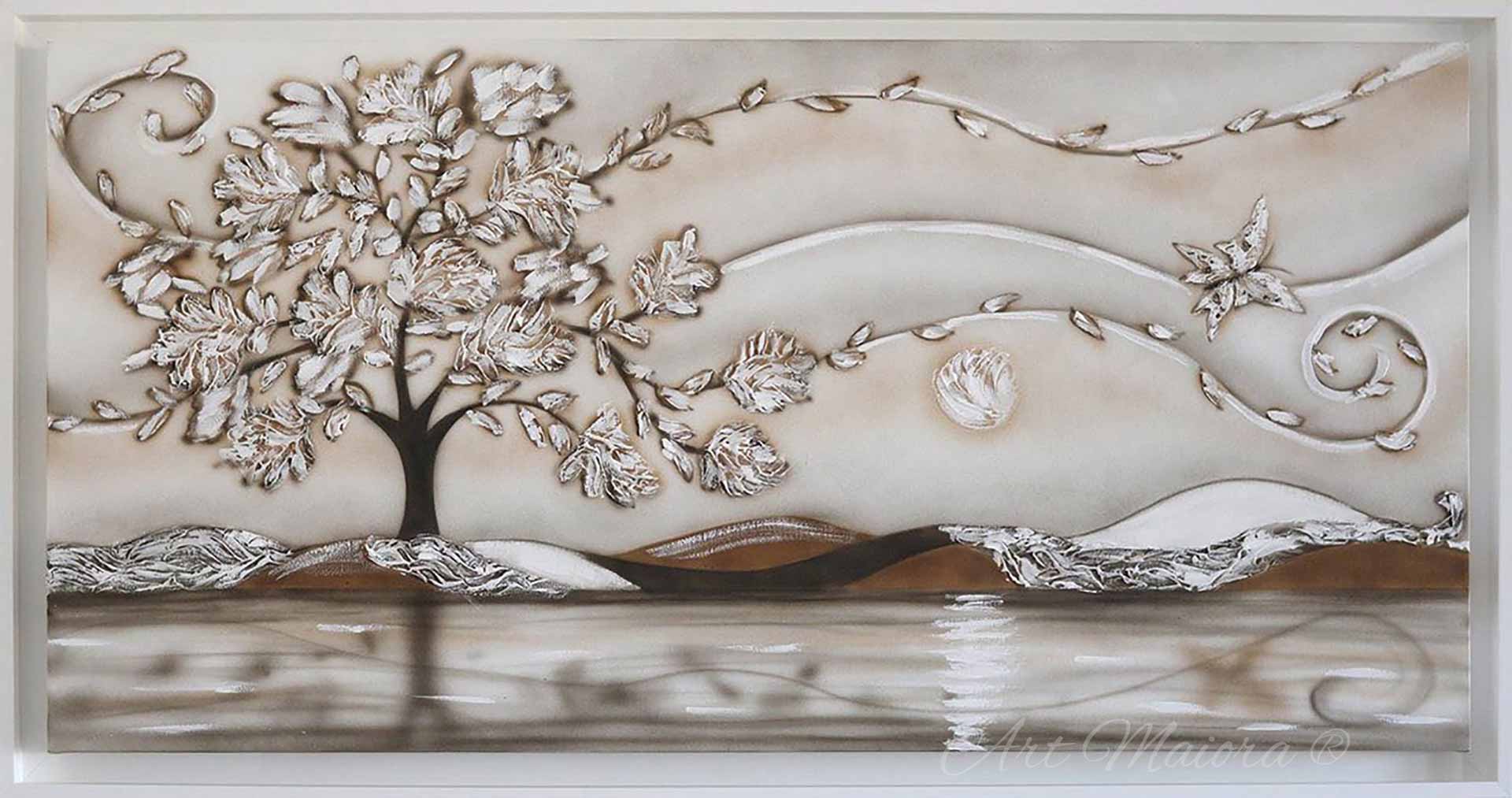 Quadro dipinto a mano “Volo”, 160x90cm, finitura tradizionale, cornice ad l bianca poro aperto.