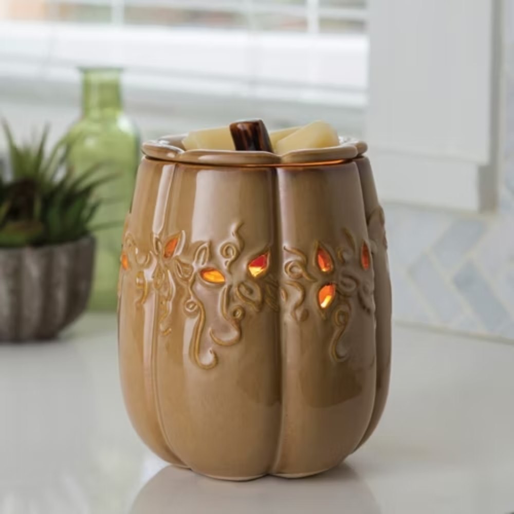 SCALDACANDELE ecc.Lampada aromatica di illuminazione «FALL HARVEST» elettricaQuesta zucca stilizzata, con le sue viti da giardino e le aperture fogliari attraverso le quali brilla la luce, si adatta meravigliosamente alla stagione autunnale.Viene fornito con una ciotola rimovibile.Basta aggiungere cera profumata alla ciotola, accendere la lampada e goderselotroverai il tuo profumo preferito dopo pochi minuti.La luce soffusa della speciale lampada riscaldante integrata crea un ambiente accogliente.Goditi in modo sicuro e pulito la cera profumata, le perline profumate con i bruciatori di fragranza degli scaldacandele:- senza fiamme libere- senza fuliggine- senza fumo o rilascio di altri inquinantiL’elegante ambiente abitativo è al centro di ogni prodotto Candle Warmers Etc.