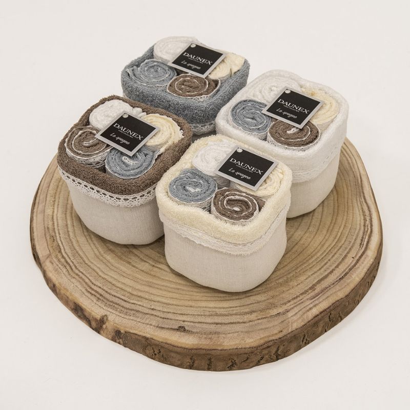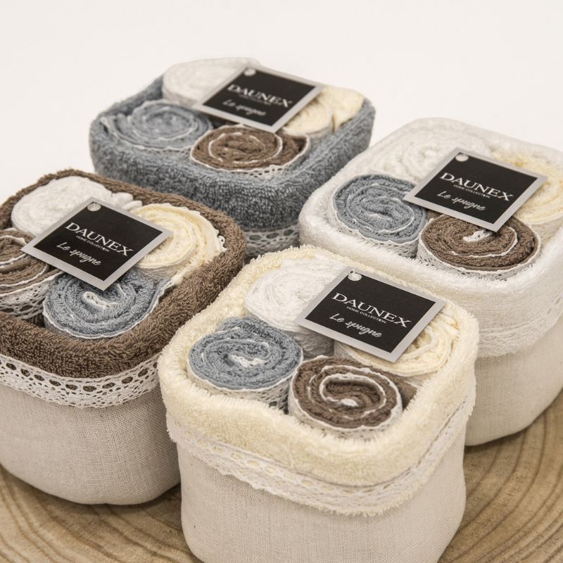 Daunex – Set 4 Lavette colori assortiti cm 30×30 in cestino di stoffa con pizzo
