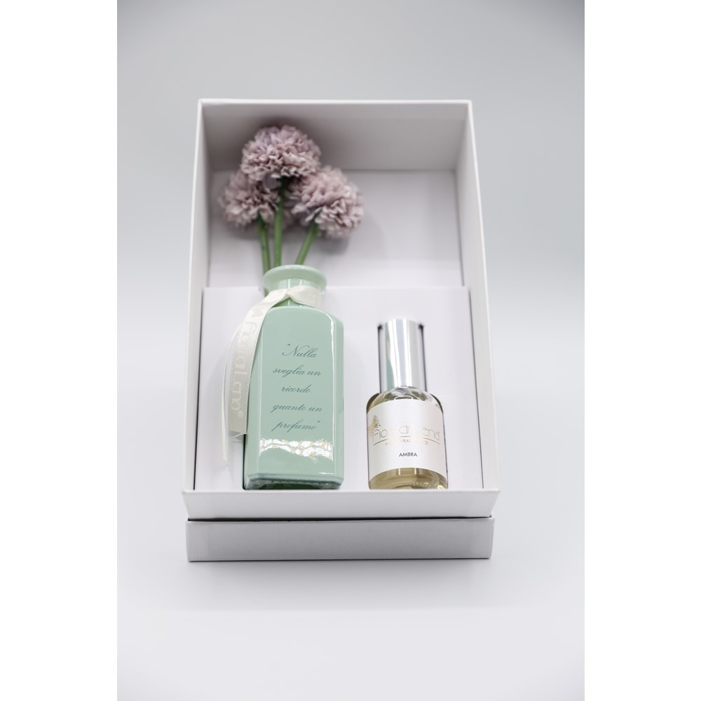 Fiori di Lena – Bottiglina con scritta e dalie con profumo spray Ambra 30 ml in scatola regalo