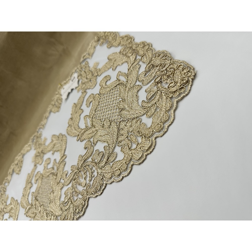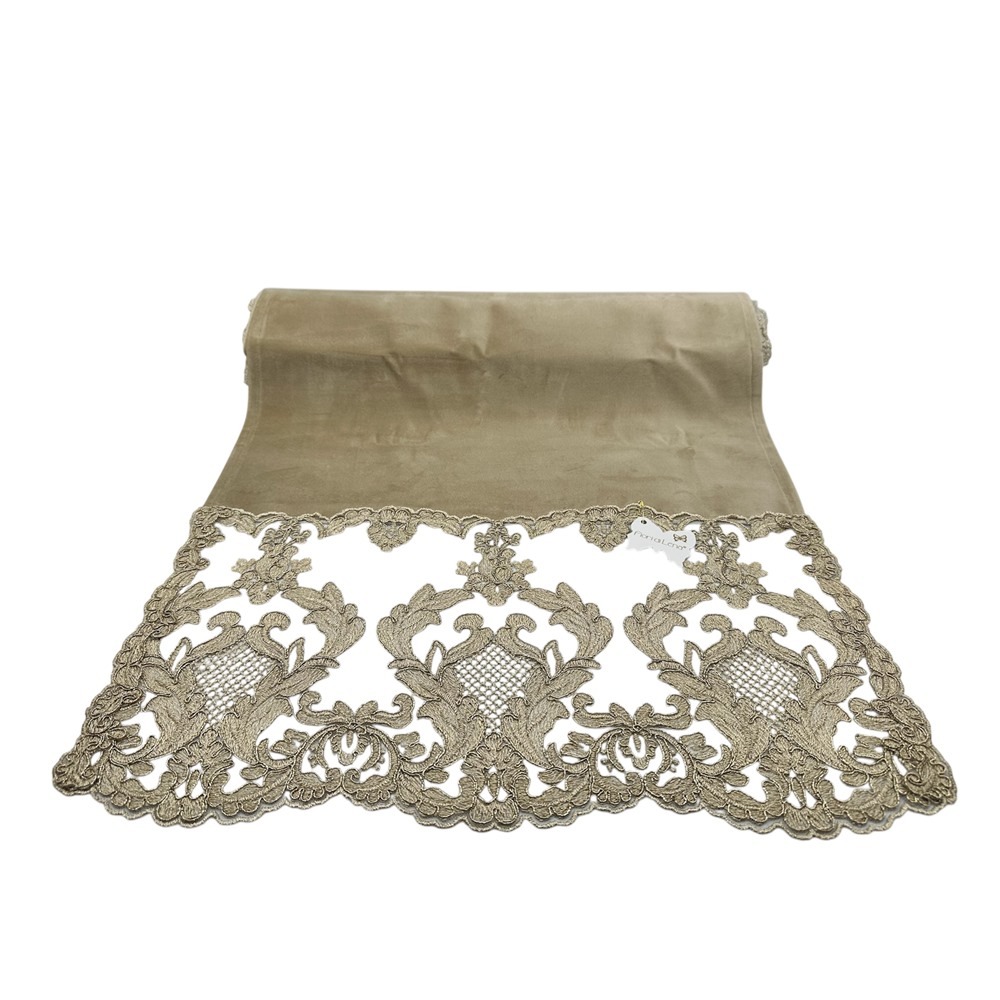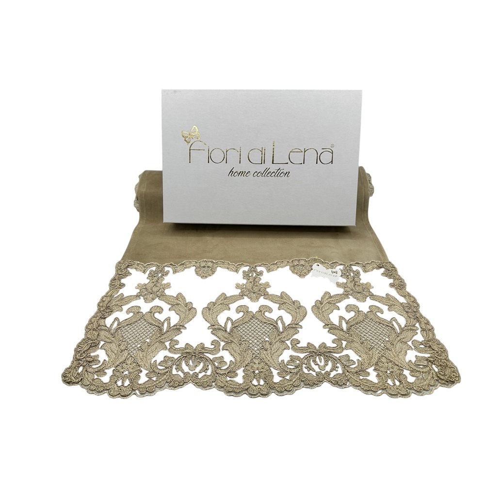 Fiori di Lena – Centro in velluto nocciola con pizzo Impero oro alle basi cm 160X47