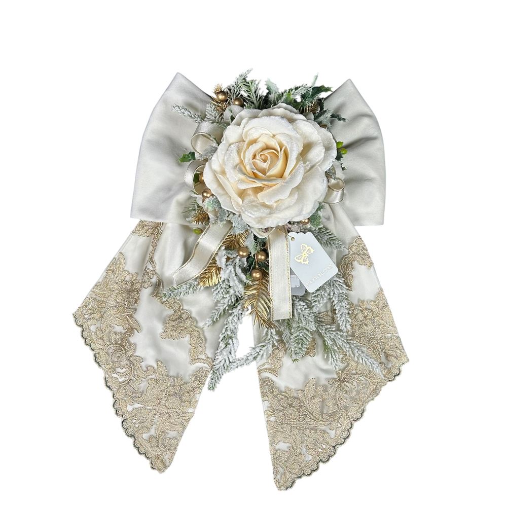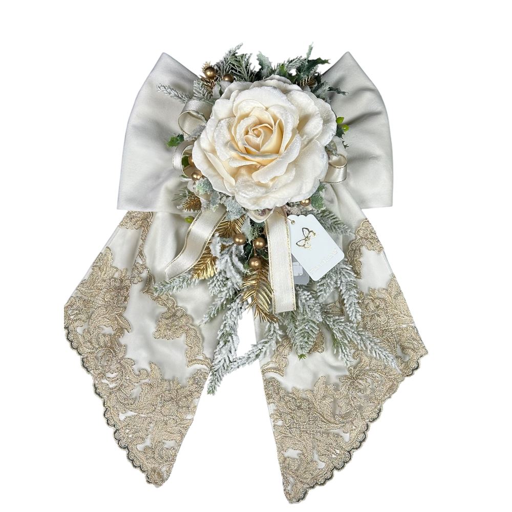Fiori di Lena – FIOCCO IN VELLUTO CON ROSA, ORTENSIE E PIZZO,