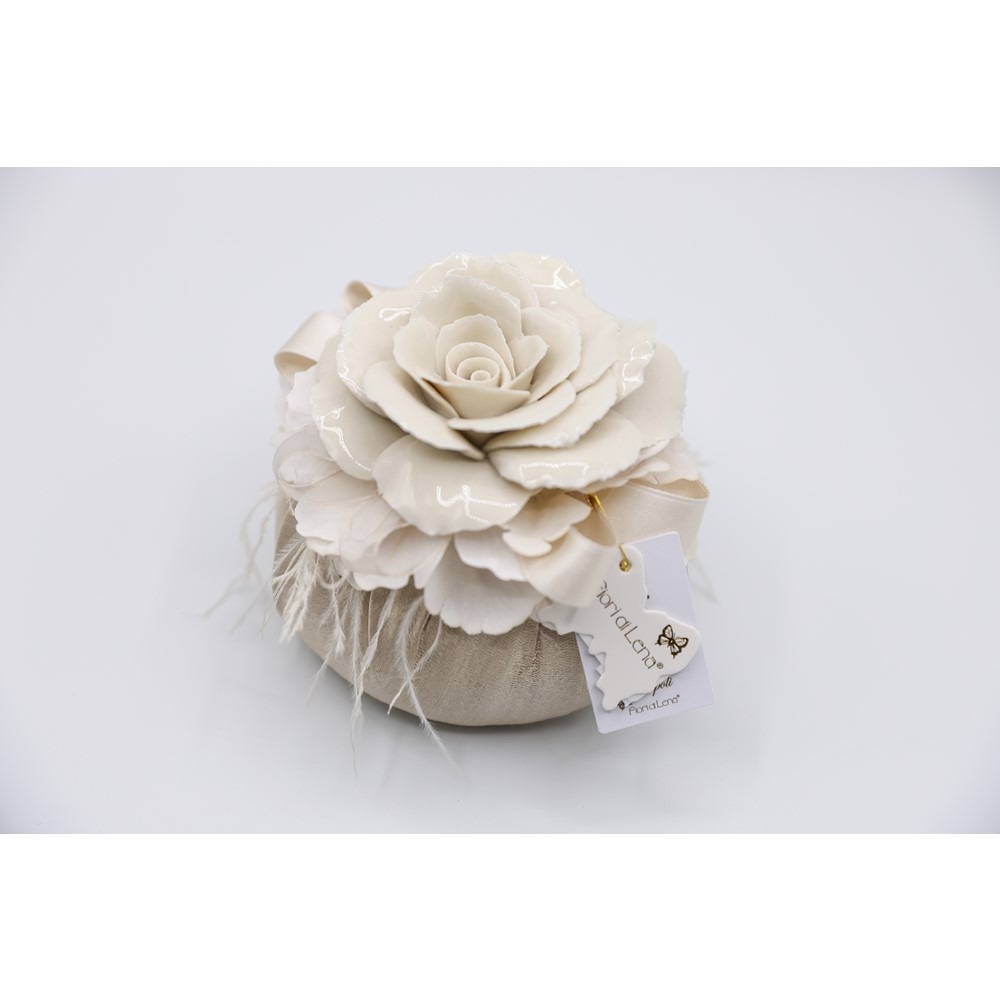 Fiori di Lena – Fiori di Lena – Puffo in seta con rosa in Capodimonte mis.5, ortensie e piume Ø 11 cm con scatola