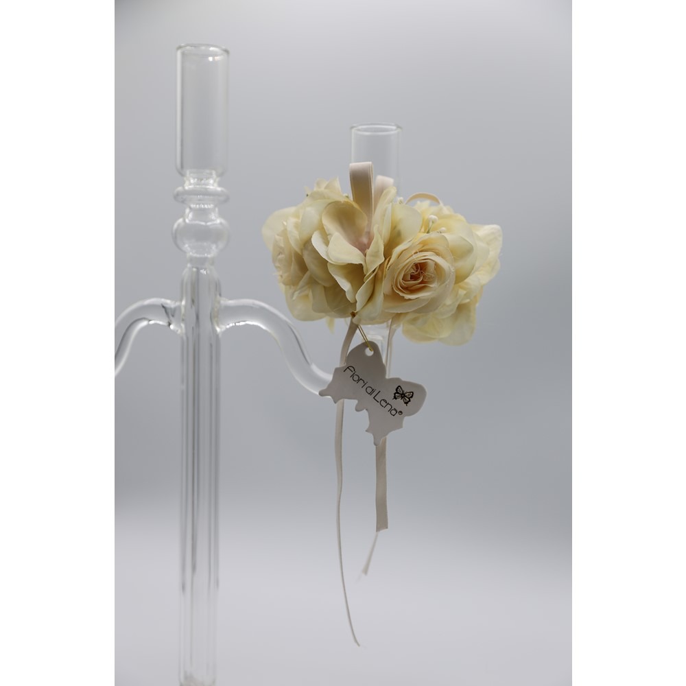 Fiori di Lena – Girocandela con 4 roselline, boccioli, ortensia avorio e nebbiolina cm 10 x 6 h ( Ø interno 3 cm )