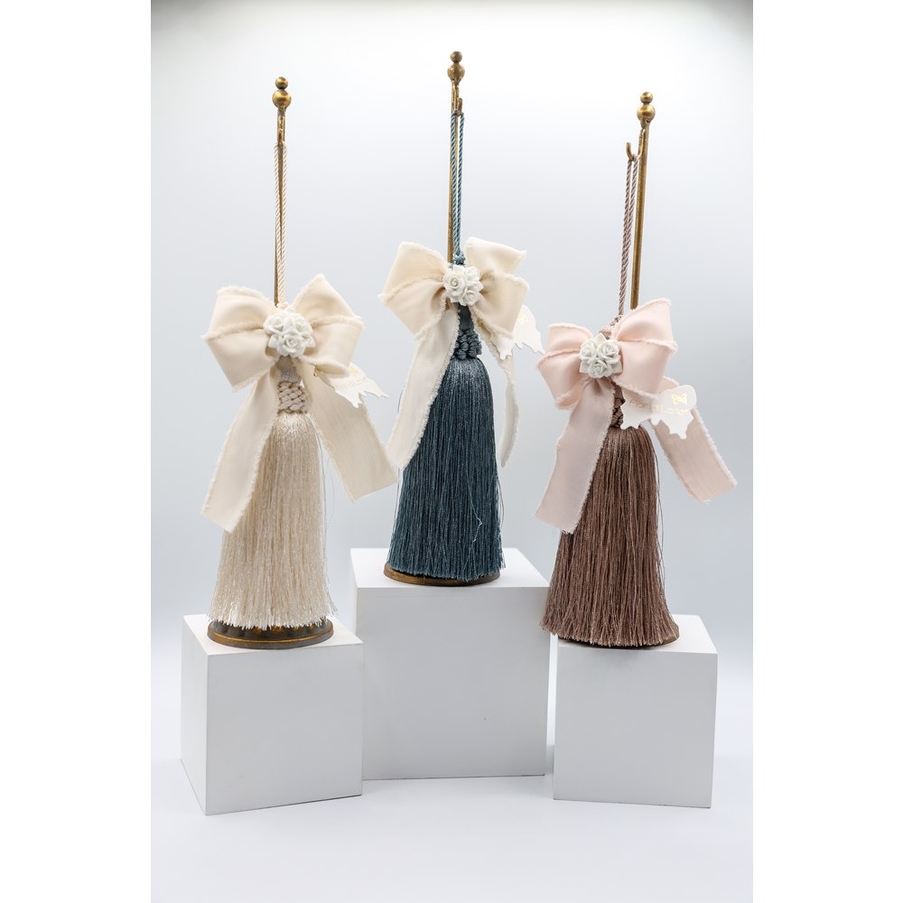 Fiori di Lena – Nappa con nastri in lino avorio e gruppetto fiori in porcellana
