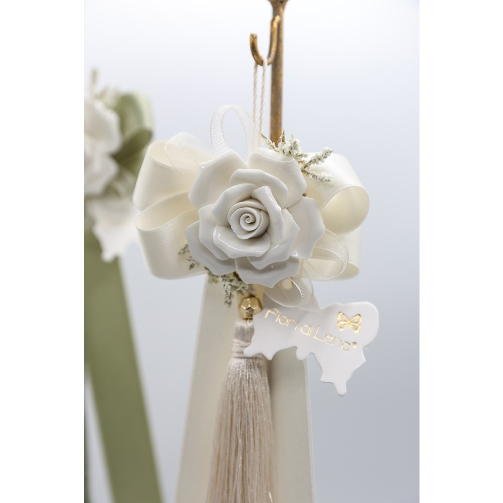Fiori di Lena – Nappina panna con nastri, nebbiolina e fiore in ceramica