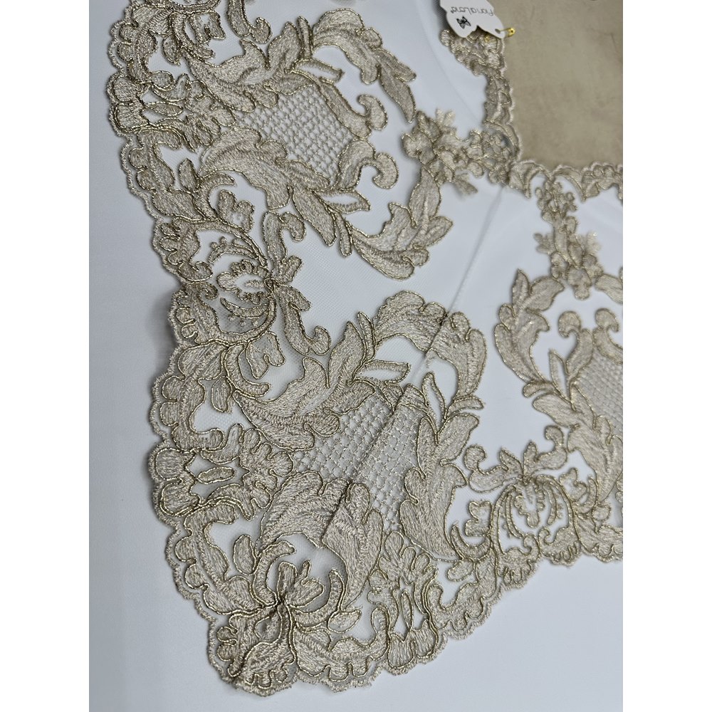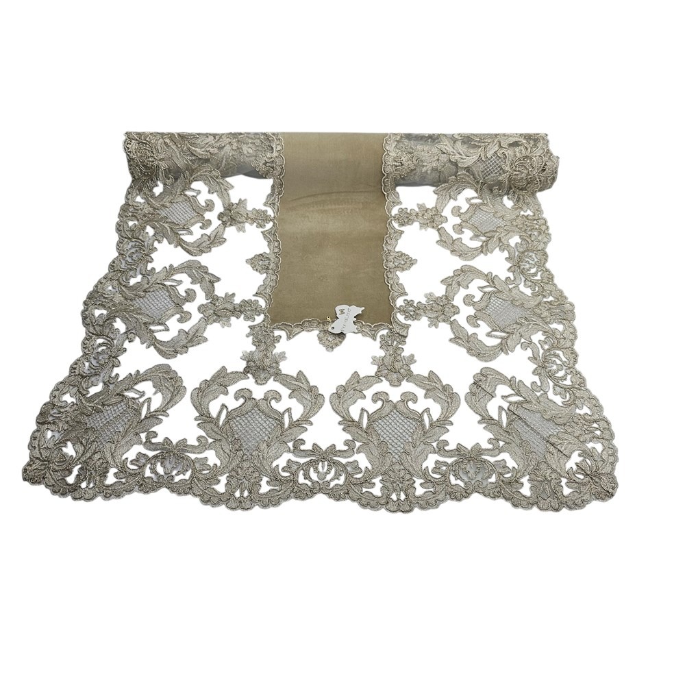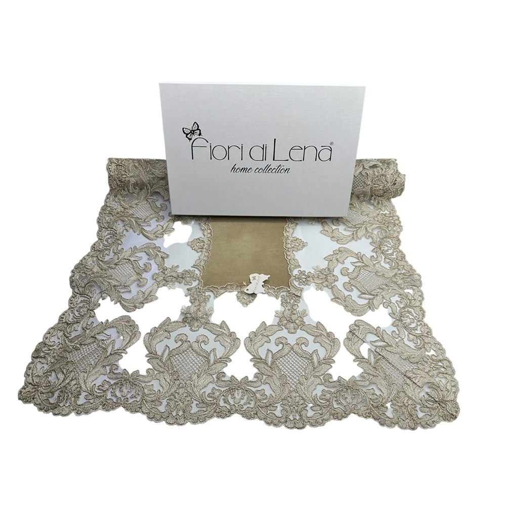 Fiori di Lena – Runner in velluto nocciola con pizzo fregio alto oro cm 140X60