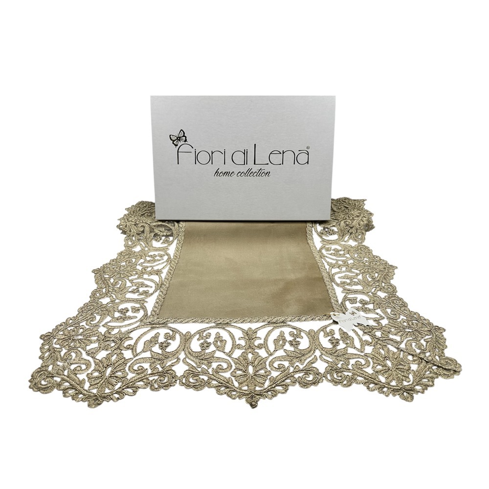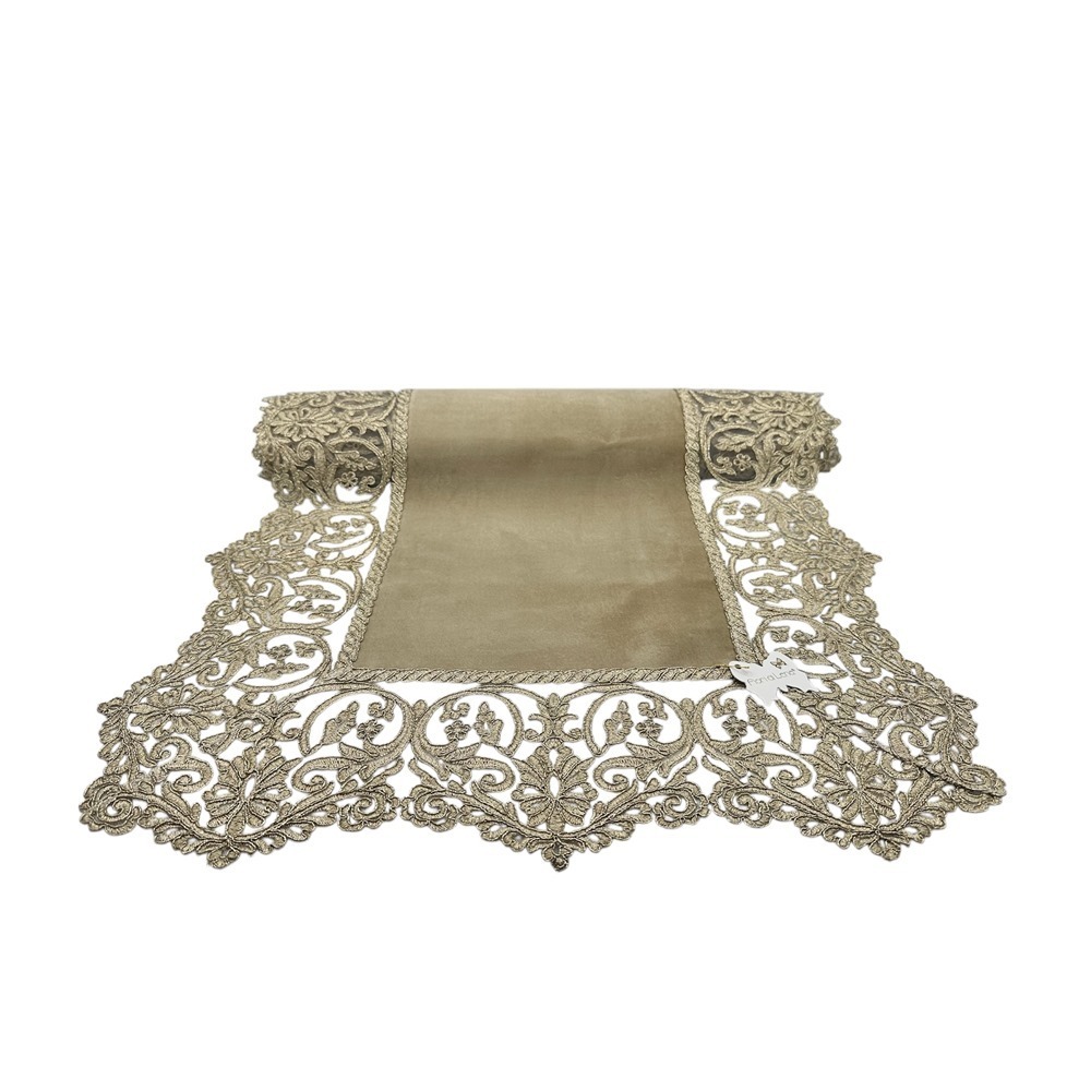 Fiori di Lena – Runner in velluto nocciola con pizzo oro cm 140X48