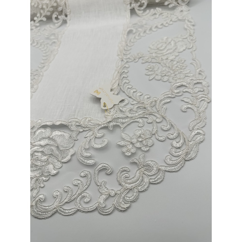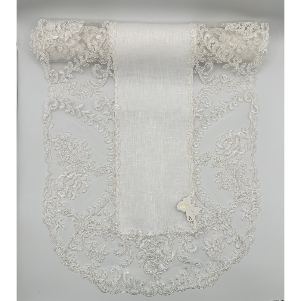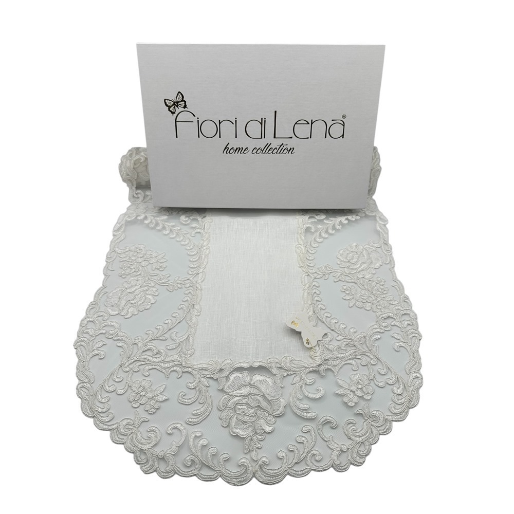 Fiori di Lena – Runner ovale in lino avorio con pizzo fregio e rose cm 140X45