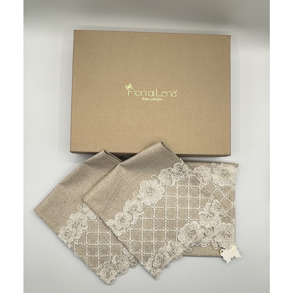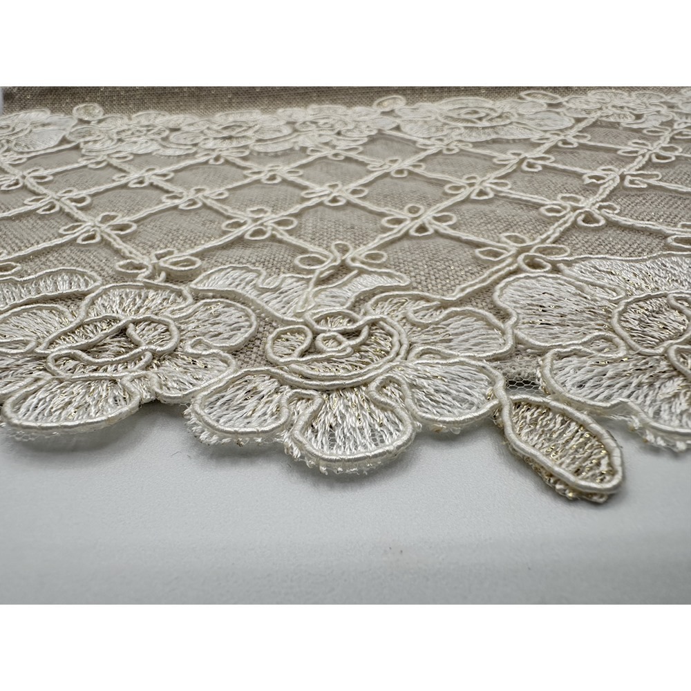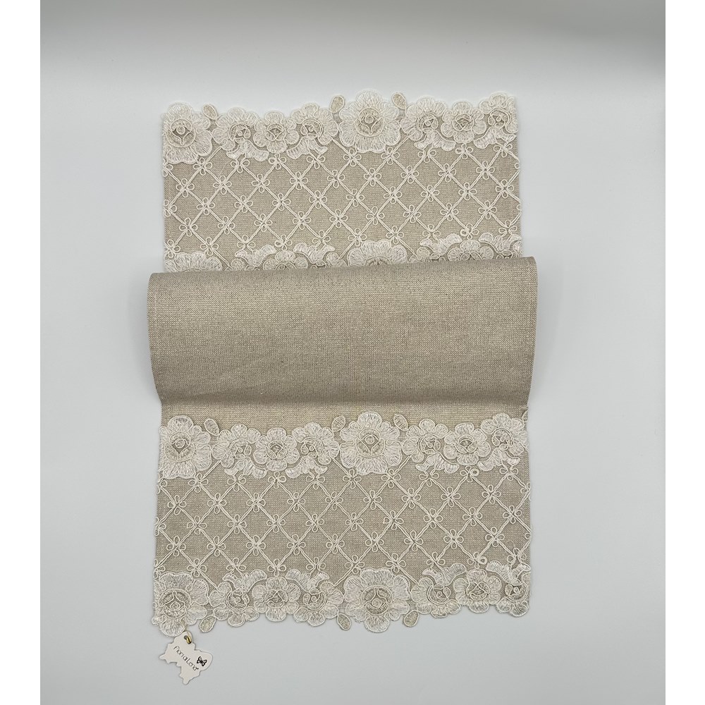 Fiori di Lena – Set corsia e due centrini in tessuto lurex con pregiata passamaneria – Una proposta unica e curata nei dettagli, pensata per sorprendere e valorizzare ogni occasione speciale con stile ed emozione.