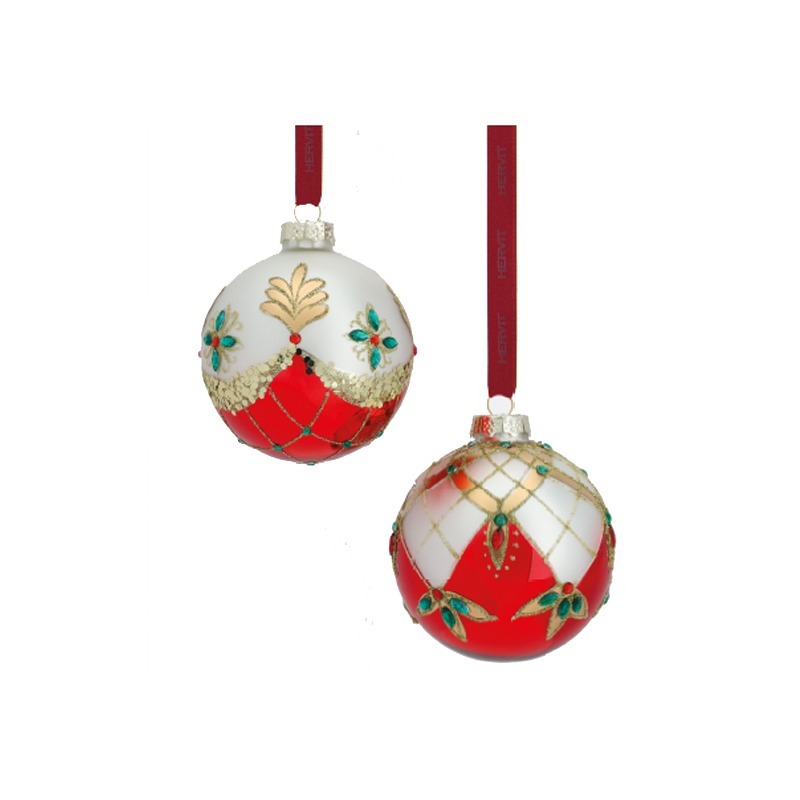 Hervit – Box 2 pz. Sfera in vetro soffiato bianca e rossa con decorazioni, diametro 9 cm, collezione Natale 2020 – Una proposta unica e curata nei dettagli, pensata per sorprendere e valorizzare ogni occasione speciale con stile ed emozione.