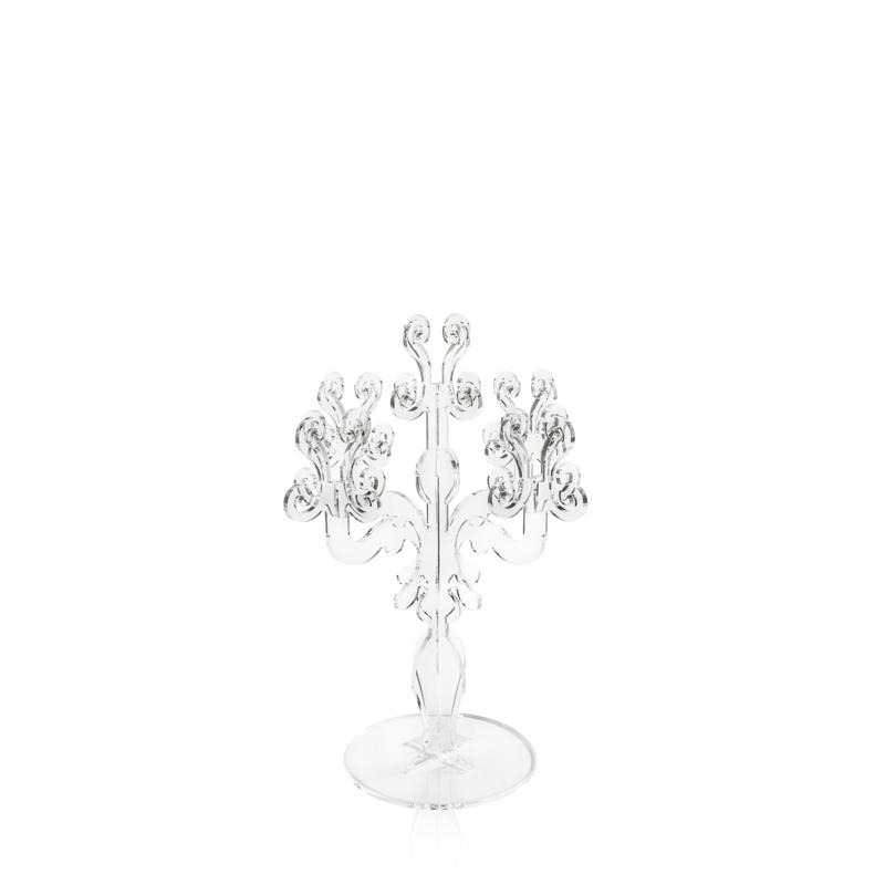 Elegante candelabro dal sapore rinascimentale adattato al nostro tempo: 5 braccia in plexiglass PMMA trasparente, con sagomature tagliate al laser che richiamano i pregiati ornamenti dei candelieri rinascimentali in cristallo di rocca. Le caratteristiche fisico-tecniche del plexiglass (antiurto, indeformabile, inalterabile, termoisolante) rendono il candelabro adatto sia in casa che outdoor. La luminosità e la brillantezza si mantengono costanti ed inalterati nel tempo. Il plexiglass PMMA da polimero vergine utilizzato da Iplex Design è atossico, ipoallergico, inodore ed antibatterico. Riciclabile 100%. Design: Iplex Team. Pensato, progettato e realizzato in Italia, con materiali italiani.