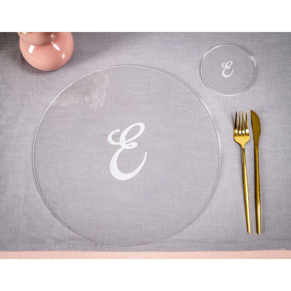iPLEX Design – Serving Set Sottobicchiere / Sottopiatto Rotondo “E” Trasp. in plexiglass 33x33x0,6h cm – Una proposta unica e curata nei dettagli, pensata per sorprendere e valorizzare ogni occasione speciale con stile ed emozione.