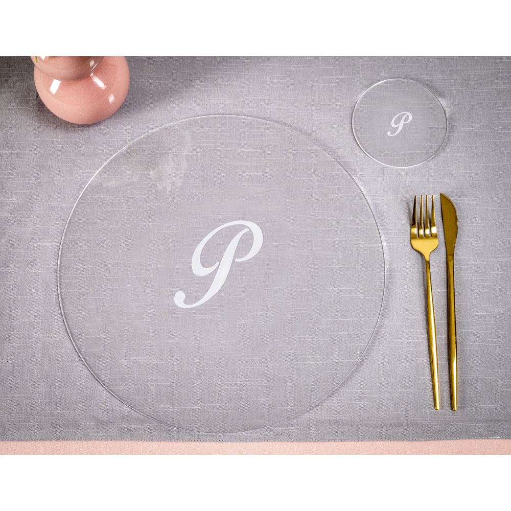 iPLEX Design – Serving Set Sottobicchiere / Sottopiatto Rotondo “P” Trasp. in plexiglass 33x33x0,6h cm – Una proposta unica e curata nei dettagli, pensata per sorprendere e valorizzare ogni occasione speciale con stile ed emozione.
