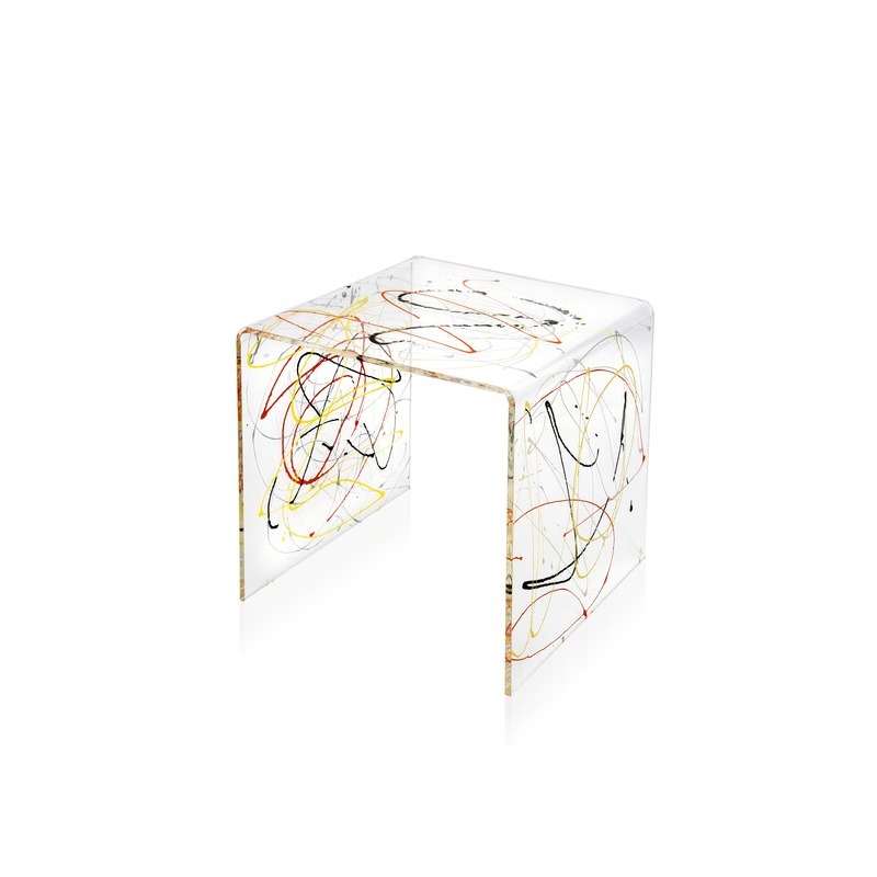 iPLEX – Tavolino design anni ’80 in plexiglass tagliato a laser, schizzo artistico colorato, dim. 40x40x40 cm Made in Italy – arredamento casa salotto studio ufficio