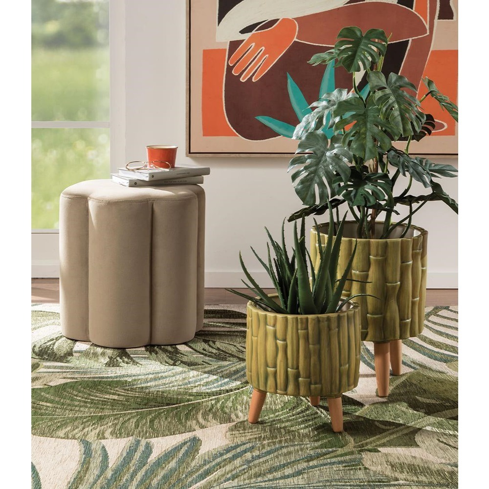 Cache-pot alto in ceramica lavorata con piedini in legno. Vaso da interni, che si ispira alle geometrie del bambù, perfetto per arredare la casa con un angolo verde. Da abbinare alla versione bassa d’ispirazione Ethno Chic per un arredamento dallo stile jungle.
